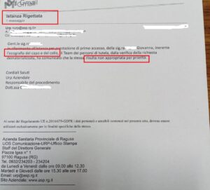 A seguito di una formale richiesta da parte dell’utente, che rivendicava il diritto al rispetto dei tempi indicati dal medico e che nel frattempo si era rivolta alla nostra associazione, l’azienda sanitaria ha emesso con incredibile rapidità un responso di rigetto, motivato dalla presunta “non appropriatezza della priorità”. Questo solleva un interrogativo inaccettabile sull’operato del medico di famiglia. Desideriamo ricordare ai vertici dell’ASP che il giudizio clinico del medico curante non è sindacabile da terzi, salvo in presenza di accertate violazioni di legge o di norme deontologiche.