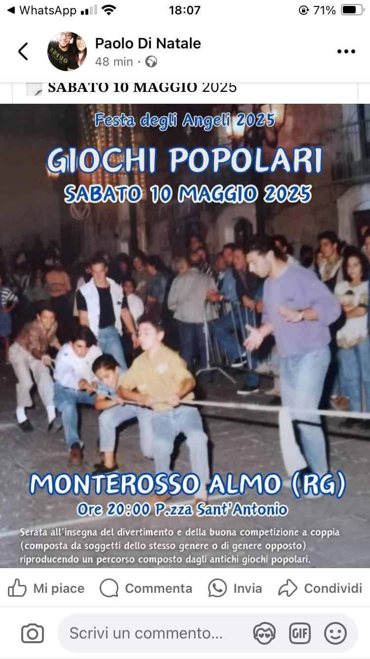 MONTEROSSO ALMO –  Questa sera, con inizio alle 20, in Piazza Sant’Antonio, si accendono le luci della tradizione con i Giochi Popolari, uno degli appuntamenti più attesi nell’ambito dei festeggiamenti in onore della Madonna Addolorata – Festa degli Angeli 2025.