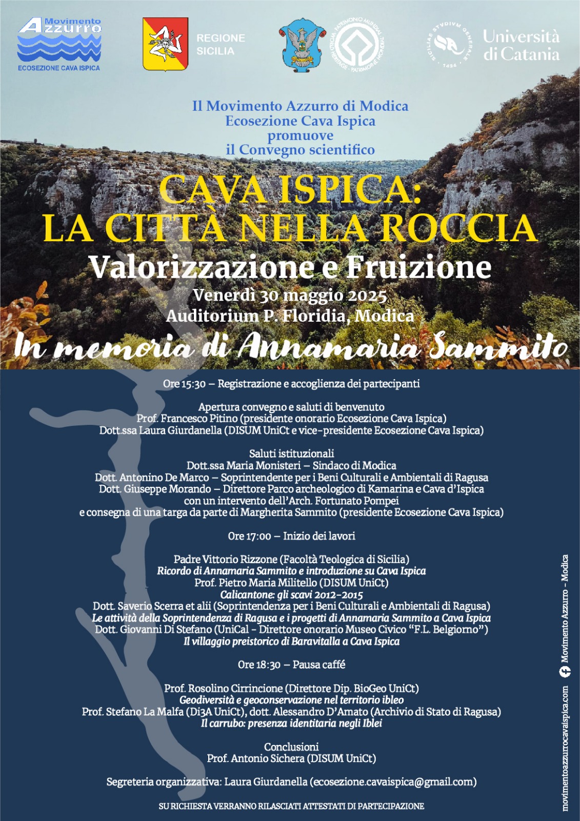 In particolare, gli organizzatori hanno voluto onorare questo importante traguardo dedicando il Convegno alla memoria di Annamaria Sammito, archeologa presso la Soprintendenza dei Beni Culturali e Ambientali di Ragusa, prematuramente scomparsa. Sincero e necessario è il tributo che l’associazione sente di porgere alla memoria della studiosa, la quale con passione e costante abnegazione ha dedicato i suoi studi e le sue ricerche a Cava Ispica. Il Convegno vedrà la partecipazione del Comune di Modica, della Soprintendenza ai Beni Culturali e Ambientali di Ragusa, il Parco archeologico di Kamarina e Cava d’Ispica, il Museo