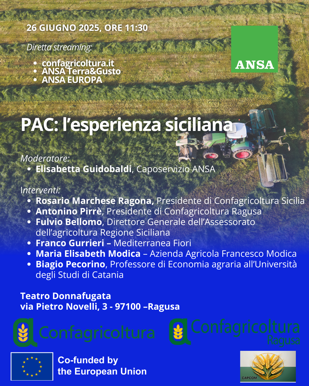 Questo sarà il tema di “PAC, l’esperienza siciliana”, convegno organizzato da Confagricoltura, in partnership con ANSA, nell’ambito di un progetto della DG AGRI (Directorate-General for Agriculture and Rural Development), che si terrà giovedì 26 giugno dalle 11.30 alle 13.00, a Ragusa, presso il Teatro Donnafugata.