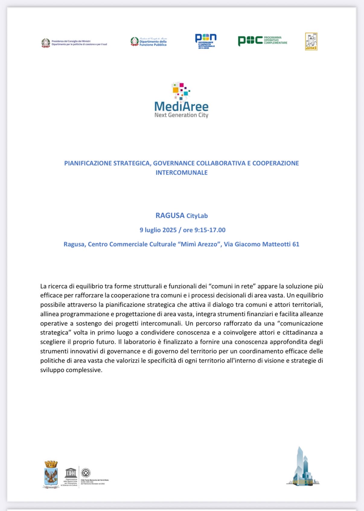 Ragusa – Il Dipartimento della Funzione Pubblica, in collaborazione con Anci Sicilia e MediAree Next Generation City, presenta “Ragusa CityLab”, un laboratorio di pianificazione strategica, governance collaborativa e cooperazione intercomunale. L’evento si terrà il 9 luglio 2025, dalle ore 9:15 alle 17:00, presso il Centro Commerciale Culturale “Mimi Arezzo” in Via Giacomo Matteotti 61 a Ragusa.