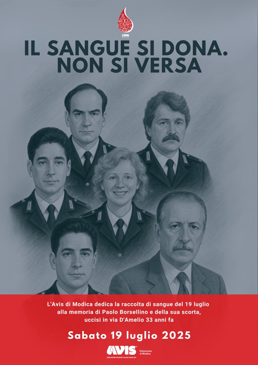 *Donare per ricordare: il 19 luglio a Modica una giornata di raccolta sangue nel nome della memoria di Borsellino e della sua scorta* In occasione del 32° anniversario della strage di via D’Amelio, la Regione Siciliana promuove in tutto il territorio una giornata speciale dedicata alla donazione del sangue, con l’obiettivo di coniugare memoria e impegno civico attraverso un gesto concreto di solidarietà Anche Modica aderisce all’iniziativa, coinvolgendo i cittadini in una raccolta straordinaria organizzata da Avis Modica presso l’Ospedale Maggiore in via Aldo Moro, sabato 19 luglio 2025 La giornata si inserisce nel quadro delle attività promosse dall’assessorato regionale alla Salute, in collaborazione con le strutture trasfusionali e le sedi territoriali AviS, per sensibilizzare la popolazione siciliana sull’importanza della donazione e per onorare la memoria del giudice Paolo Borsellino e degli agenti della sua scorta, uccisi nell’attentato mafioso del 1992 Ogni unità di sangue donata in questa occasione assume un valore simbolico ancora più profondo: non solo un contributo essenziale alla rete sanitaria regionale, ma anche un atto di partecipazione civile e di testimonianza contro ogni forma di violenza e sopraffazione Avis Modica invita i donatori abituali e tutti i cittadini in buona salute a partecipare, sottolineando come ogni singolo gesto possa fare la differenza per chi attende una trasfusione. L’iniziativa rappresenta anche un’opportunità per avvicinare nuovi volontari al mondo della donazione e rafforzare il legame tra cittadinanza attiva, salute pubblica e memoria storica Per informazioni e prenotazioni è possibile contattare il numero unico 0932 1917748