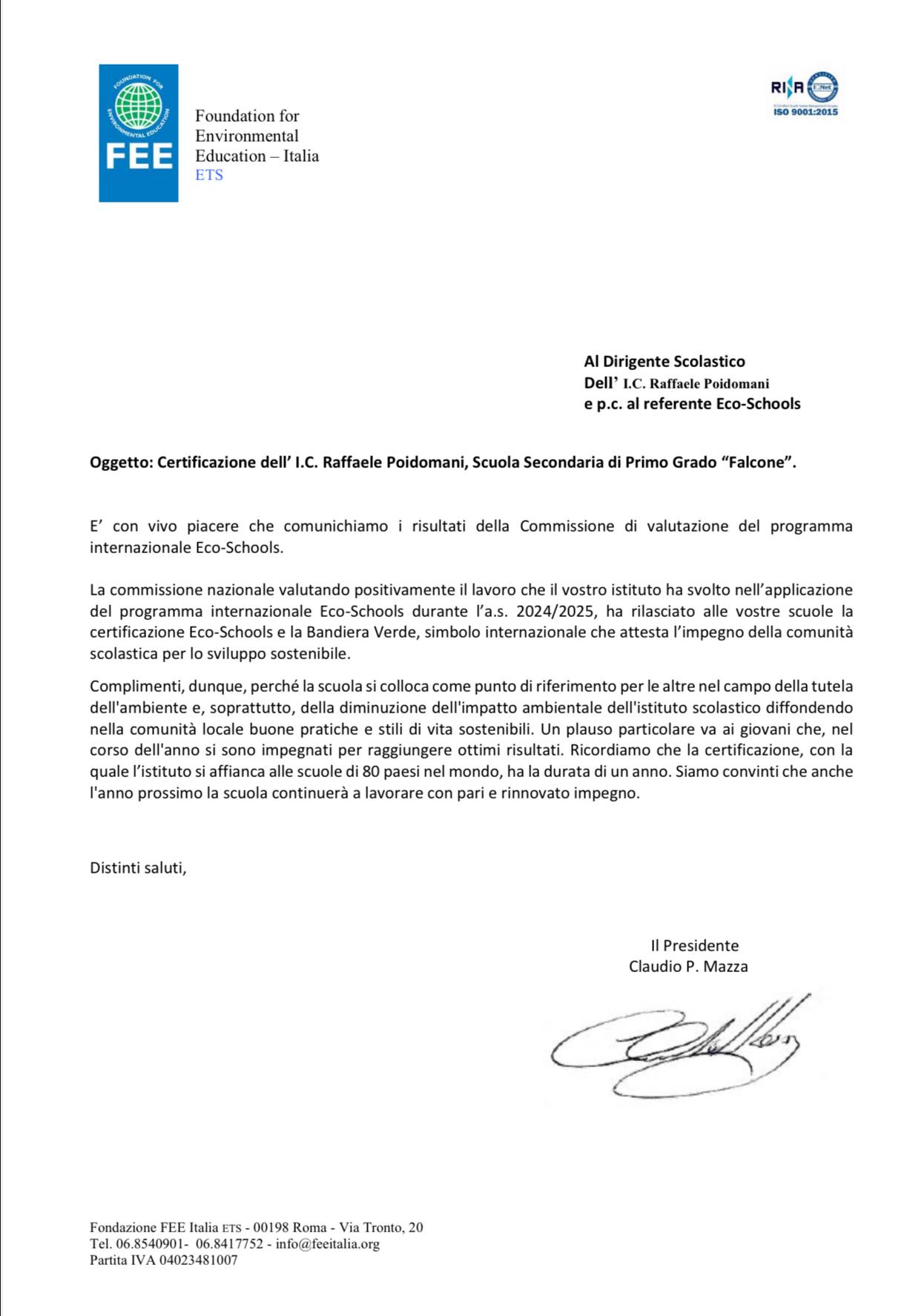 Modica, 22 Luglio 2025 – Grandi notizie per la comunità scolastica di Modica! La scuola secondaria di primo grado “Falcone”, parte dell’Istituto Comprensivo “Raffaele Poidomani”, ha raggiunto un traguardo di eccellenza, ottenendo la Certificazione Eco-Schools e la prestigiosa Bandiera Verde. Questo importante riconoscimento internazionale premia l’impegno costante e le azioni concrete messe in atto dalla scuola per lo sviluppo sostenibile e la tutela dell’ambiente.