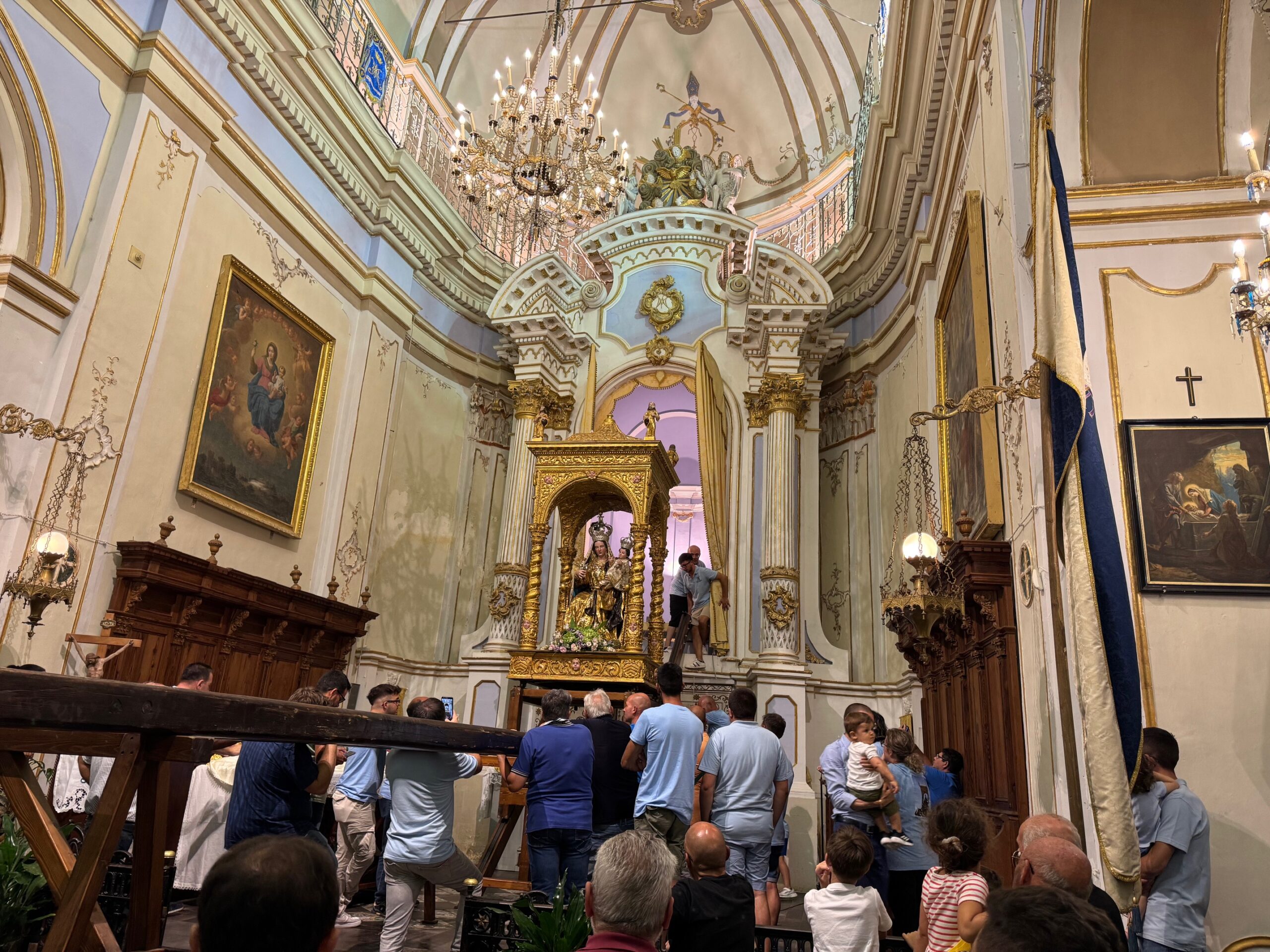 Giarratana – Un rito di grande sacralità. Vissuto, da fedeli e devoti, con estrema spiritualità. Gremita di persone, ieri sera, durante la “Scinnuta” del simulacro della Patrona di Giarratana, la basilica di Sant’Antonio Abate. Il modo più semplice e, allo stesso tempo, intenso per rinnovare il patto d’intesa con la Vergine. Lo speciale momento, condito da semplici ma significativi gesti, che si ripetono da sempre, ha dato il via ai solenni festeggiamenti in onore della Madonna della neve. Il suono delle campane e lo sparo dei colpi a cannone hanno annunciato a tutta Giarratana la discesa dalla cappella dell’altare maggiore del venerato simulacro. Una cerimonia molto partecipata preceduta dalla esibizione del gruppo “Tamburi di Giarratana” sul sagrato della basilica. Lo stesso gruppo, in precedenza, aveva animato, con le proprie sonorità acustiche, alcune vie di Giarratana. Subito dopo la discesa del simulacro, quest’ultimo è stato condotto dai portatori lungo la navata centrale per dare modo a tutti i fedeli di ammirarlo e, soprattutto, di venerarlo. Subito dopo, lo stesso è stato sistemato in una zona laterale rispetto all’altare maggiore. La discesa del simulacro è stata accompagnata dalle litanie lauretane e dell’inno alla Patrona. Con il suo trono a baldacchino, il simulacro della Madonna della neve è uno dei più singolari, per la sua foggia, tra quelli presenti nelle chiese della Diocesi di Ragusa. Da oggi e sino al 31 luglio, intanto, nella basilica di Sant’Antonio abate, alle 18,30 ci sarà la preghiera meditata del Rosario e alle 19 la celebrazione eucaristica. Tra le iniziative del programma culturale-folkloristico, oggi alle 21 è in programma il cineforum con la proiezione del film “Terra di Maria” sul sagrato della basilica. Domani, invece, alle 21, il concerto del coro parrocchiale Regina Caeli diretto dal maestro Francesco Giaquinta. L’appuntamento, anche in questo caso, si terrà in basilica. Ad occuparsi della promozione degli eventi religiosi e folkloristici che stanno caratterizzando questa e altre feste del territorio ibleo l’impresa Gali group trasporti e logistica che ha inteso mettere in rilievo specifico il carattere identitario dell’appuntamento in questione.