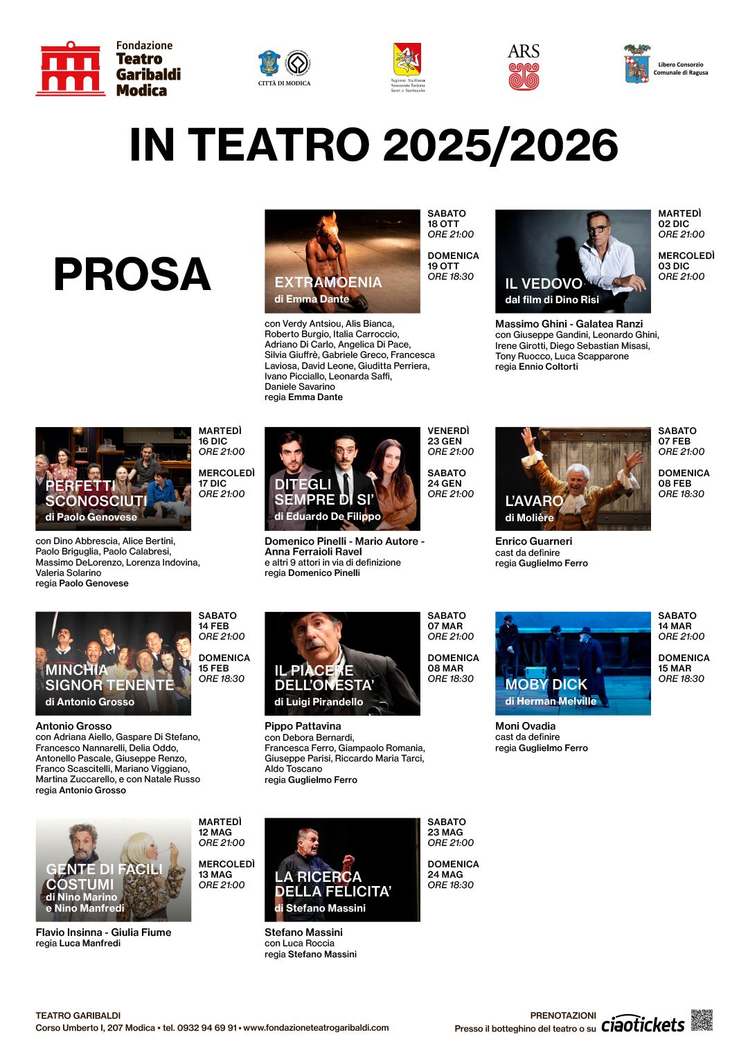 A sostegno della stagione anche la Regione Sicilia come conferma l’on. Ignazio Abbate: “Ormai la Fondazione Teatro Garibaldi è punto di riferimento per prosa e musica nel Sud Est della Sicilia con una programmazione di assoluta qualità. Da qualche anno in Finanziaria, mediante la mia attività parlamentare in Commissione Bilancio, è ormai consuetudine un provvedimento economico dedicato al sostegno delle attività culturali e agli interventi di riqualificazione”. La stagione parte già sabato 18 ottobre alle 21.00 e domenica 19 ottobre alle 18.30 con “Extra moenia” della poliedrica Emma Dante, un’opera intensa che racconta storie di emarginazione attraverso le straordinarie interpretazioni di un nutrito gruppo di bravissimi attori. Martedì 2 e mercoledì 3 dicembre sarà la volta de “Il vedovo”, dal celebre film di Dino Risi, con Massimo Ghini e Galatea Ranzi e altri attori diretti da Ennio Coltorti in una commedia brillante che intreccia ironia e leggerezza. Martedì 16 e mercoledì 17 dicembre andrà in scena “Perfetti sconosciuti” di Paolo Genovese, con un cast di grandi interpreti composto da Dino Abbrescia, Alice Bertini, Paolo Briguglia, Paolo Calabresi, Massimo DeLorenzo, Lorenza Indovina e Valeria Solarino, per una riflessione corale e ironica sul confine tra privacy e vita sociale.