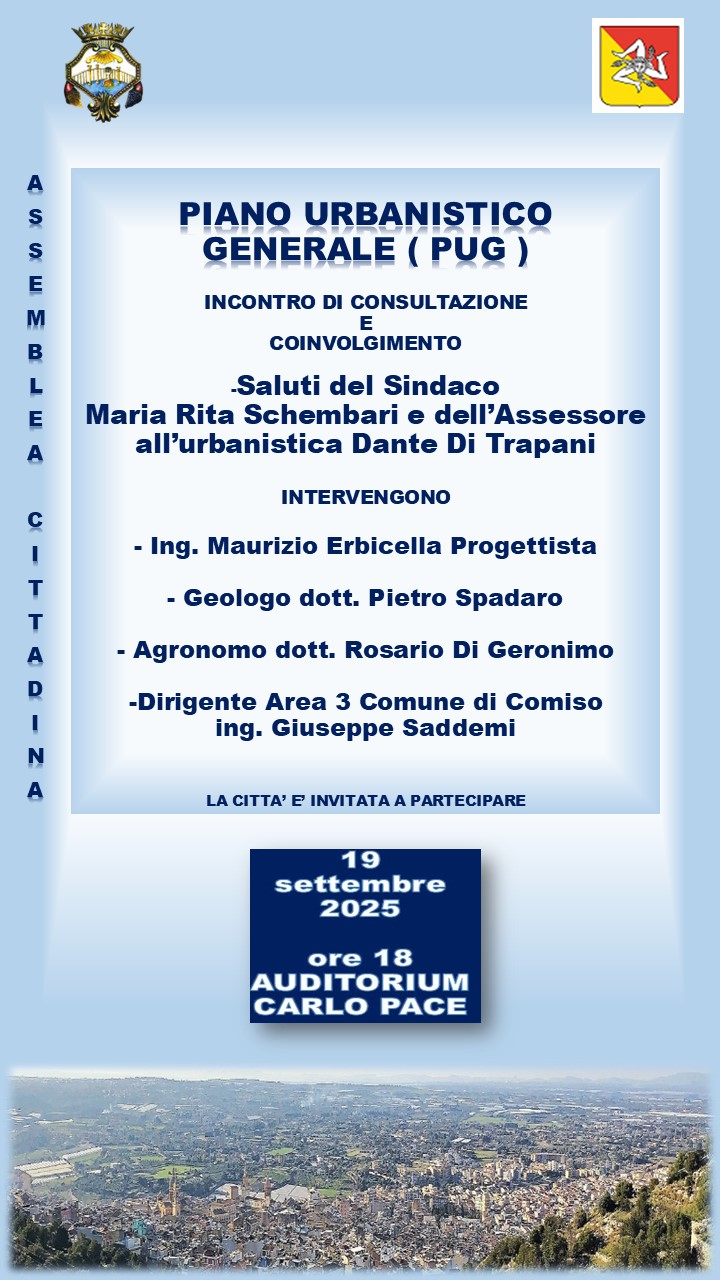 Comiso – Si entra nel vivo dell’iter del PUG (Piano Urbanistico Generale) che vedrà la prima assemblea aperta alla cittadinanza il 19 settembre, alle ore 18.00, presso l’Auditorium “Carlo Pace”. La nota arriva dall’assessore all’Urbanistica, Dante Di Trapani.