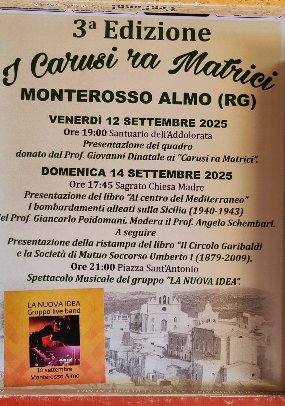Monterosso Almo, 14 Settembre 2025 – Una serata all’insegna della cultura e della memoria storica quella organizzata oggi, 14 settembre, in occasione della 3ª edizione de I Carusi ra Matrici. L’appuntamento, promosso nel cuore del centro storico e nell’ambito dei festeggiamenti in onore di Maria SS Addolorata patrona del borgo ibleo,unisce momenti di riflessione, divulgazione storica e spettacolo musicale, coinvolgendo la comunità attorno alla propria identità culturale. La manifestazione si apre alle 17,45 sul sagrato della Chiesa Madre, dove verrà presentato il volume “Al centro del Mediterraneo. I bombardamenti alleati sulla Sicilia (1940-1943)” del prof. Giancarlo Poidomani, storico attento alle vicende del Novecento siciliano. A moderare l’incontro sarà il monterossano prof. Angelo Schembari, che guiderà il dialogo con l’autore su una pagina drammatica ma fondamentale della storia dell’isola. Subito dopo, sarà protagonista la memoria cittadina con la presentazione della ristampa del libro “Il Circolo Garibaldi e la Società di Mutuo Soccorso Umberto I (1879-2009)”, un’opera che ripercorre più di un secolo di vita associativa e solidaristica, testimoniando il ruolo dei circoli nella crescita sociale ed economica della comunità locale. La giornata si concluderà con un momento di festa. Alle 21 in Piazza Sant’Antonio salirà sul palco il gruppo musicale “La Nuova Idea”, pronto a coinvolgere il pubblico presente con il suo spettacolo. L
