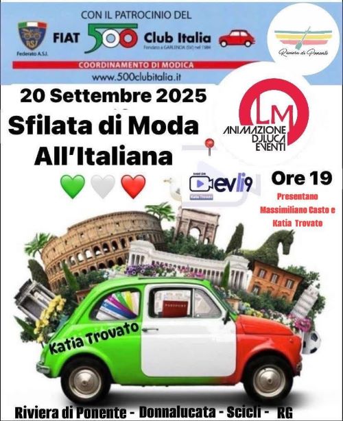 Donnalucata (Scicli) – Un appuntamento all’insegna dell’eleganza e dello stile Made in Italy attende la Riviera di Ponente a Donnalucata. Sabato 20 settembre 2025, alle ore 19, si terrà una serata di Moda all’Italiana”, un evento patrocinato dal Fiat 500 Club Italia – coordinamento di Modica, che promette di unire moda, tradizione e passione per l’Italia. La serata, presentata da Massimiliano Casto e Katia Trovato, sarà animata da LM Eventi di Luca e arricchita dalle collaborazioni artistiche e musicali, trasformando Donnalucata in una passerella a cielo aperto. La scelta della storica Fiat 500, simbolo intramontabile di italianità, fa da filo conduttore all’iniziativa che vuole celebrare non solo la moda, ma anche il patrimonio culturale e paesaggistico del Bel Paese. Un’occasione imperdibile per cittadini e turisti che, tra i colori del tricolore e lo scenario suggestivo della Riviera di Ponente, potranno vivere una serata di spettacolo, creatività e orgoglio italiano. Appuntamento: 20 settembre 2025, ore 19 – Riviera di Ponente, Donnalucata (Scicli).