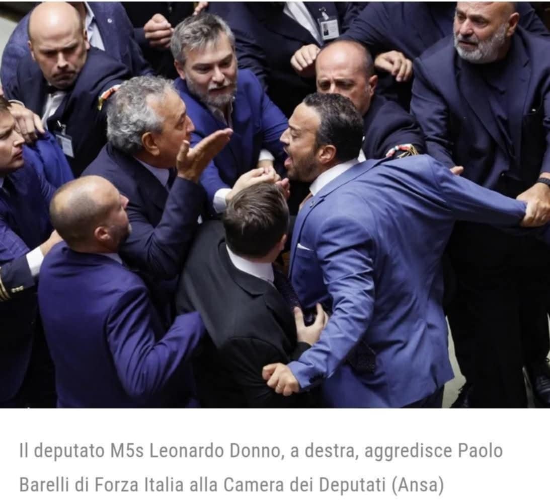 Un esponente del PD, tale Claudio Chiarotti a proposito di teste in giù, urla in aula: “Non dire cazzate, vi abbiamo già appeso per i piedi una volta”.
