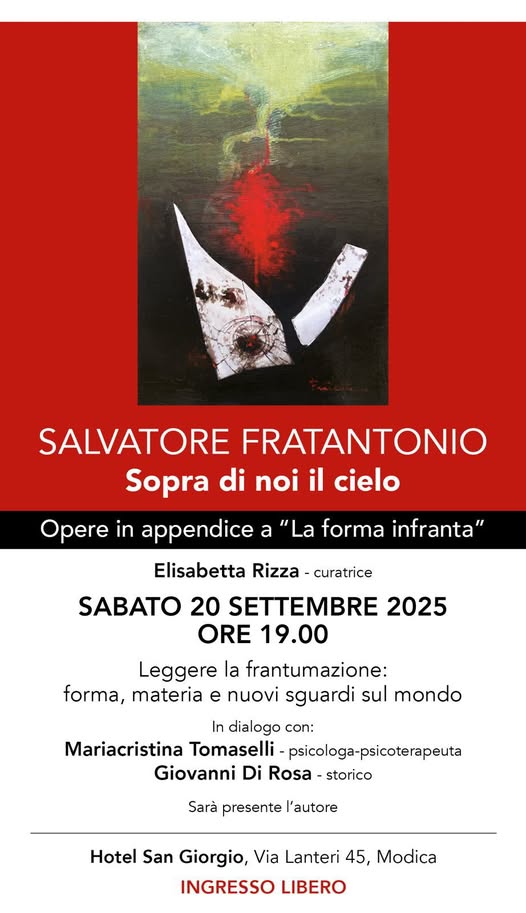 Modica, 20 settembre 2025 – Un evento artistico e culturale unico si terrà questa sera, alle 19, presso l’Hotel San Giorgio a Modica. L’appuntamento, dal titolo “Non solo sull’opera, ma con l’opera”, vedrà protagonista l’artista Salvatore Fratantonio e le sue “forme infrante”.
