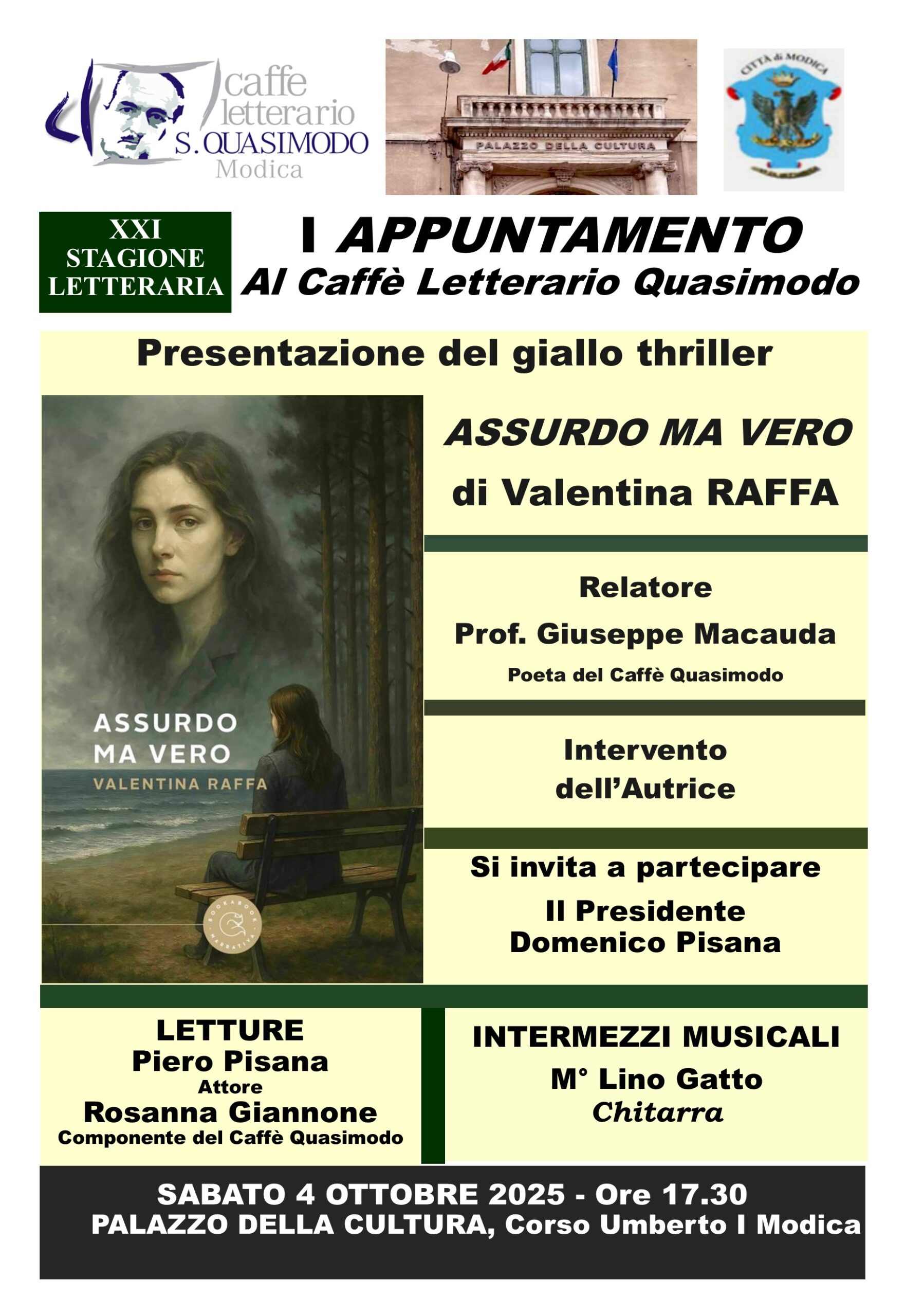 Al centro della serata il giallo thriller “Assurdo ma vero”, che sarà presentato da Giuseppe Macauda , poeta del Caffè Quasimodo. L’incontro sarà arricchito dalle letture dell’attore Piero Pisana e della prof.ssa Rosanna Giannone, componente del Caffè Quasimodo e docente dell’Istituto “Verga” di Modica, e dalle note alla chitarra del M° Lino Gatto, Direttore artistico del Caffè Quasimodo.