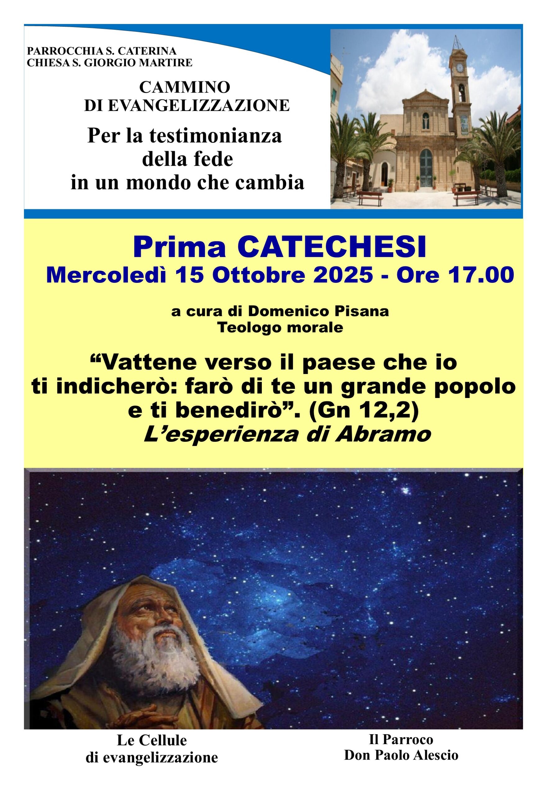 La prima catechesi del cammino avrà come oggetto l’esperienza di Abramo e i versetti biblici di Gn 12,2: “Vattene verso il paese che io ti indicherò: farò di te un grande popolo e ti benedirò”.