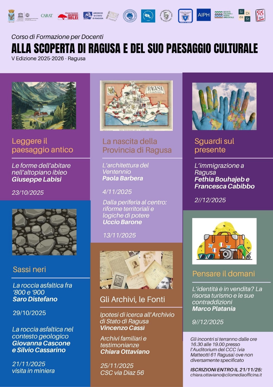 Il percorso formativo si articola in 8 incontri che si terranno al CCC – Centro Commerciale Culturale di via Matteotti 61, dalle ore 16:30 alle 19:00. Si partirà giovedì 23 ottobre con la lezione dell’archeologo Giuseppe Labisi (Università di Costanza, Germania), dedicata all’analisi delle tracce di insediamenti antichi e medievali nel territorio ragusano. Seguiranno approfondimenti su aspetti specifici del nostro paesaggio, a partire dalla presenza della roccia asfaltica: un incontro è dedicato alla storia delle attività imprenditoriali legate alla sua estrazione, con la lezione del dott. Saro Di Stefano (mercoledì 29 ottobre) e una suggestiva “visita in miniera” che sarà guidata dai geologi Giovanna Cascone e Silvio Cassarino (giovedì 21 novembre).