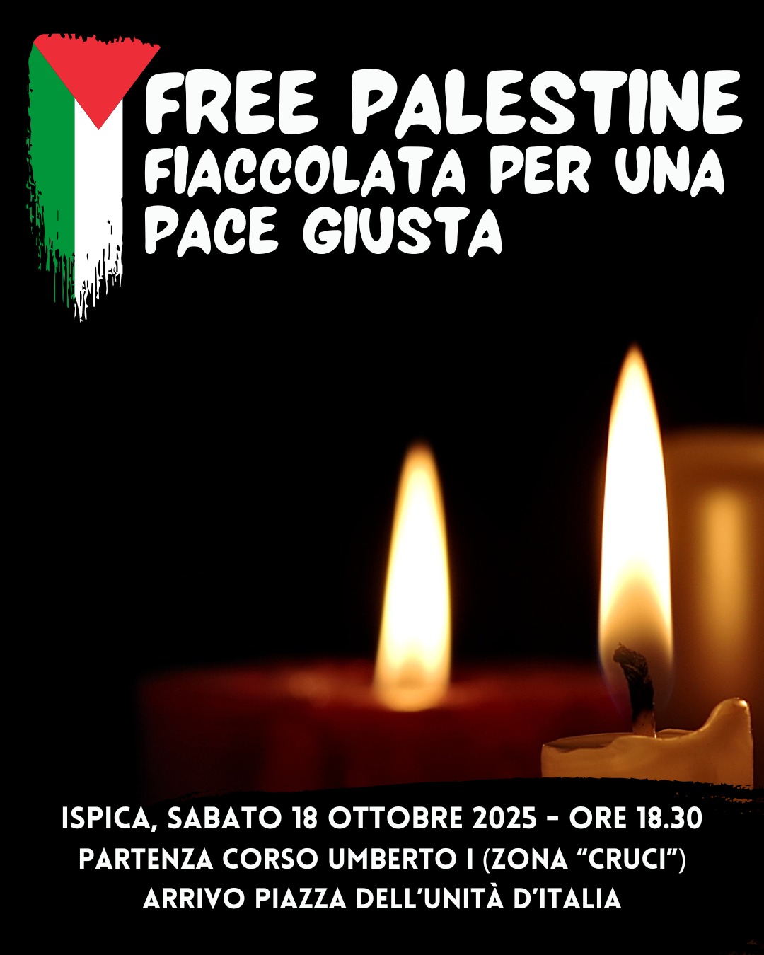 Ispica, 16 ottobre 2025 – Sabato prossimo, a partire dalle ore 18:30, Ispica ospiterà la manifestazione “Fiaccolata per la Palestina”, promossa da un ampio fronte di realtà associative e civiche, tra cui CGIL, ANPI, Legambiente, Libera, Auser, Articolo 32, Teniamoci per mano e altre organizzazioni del territorio.