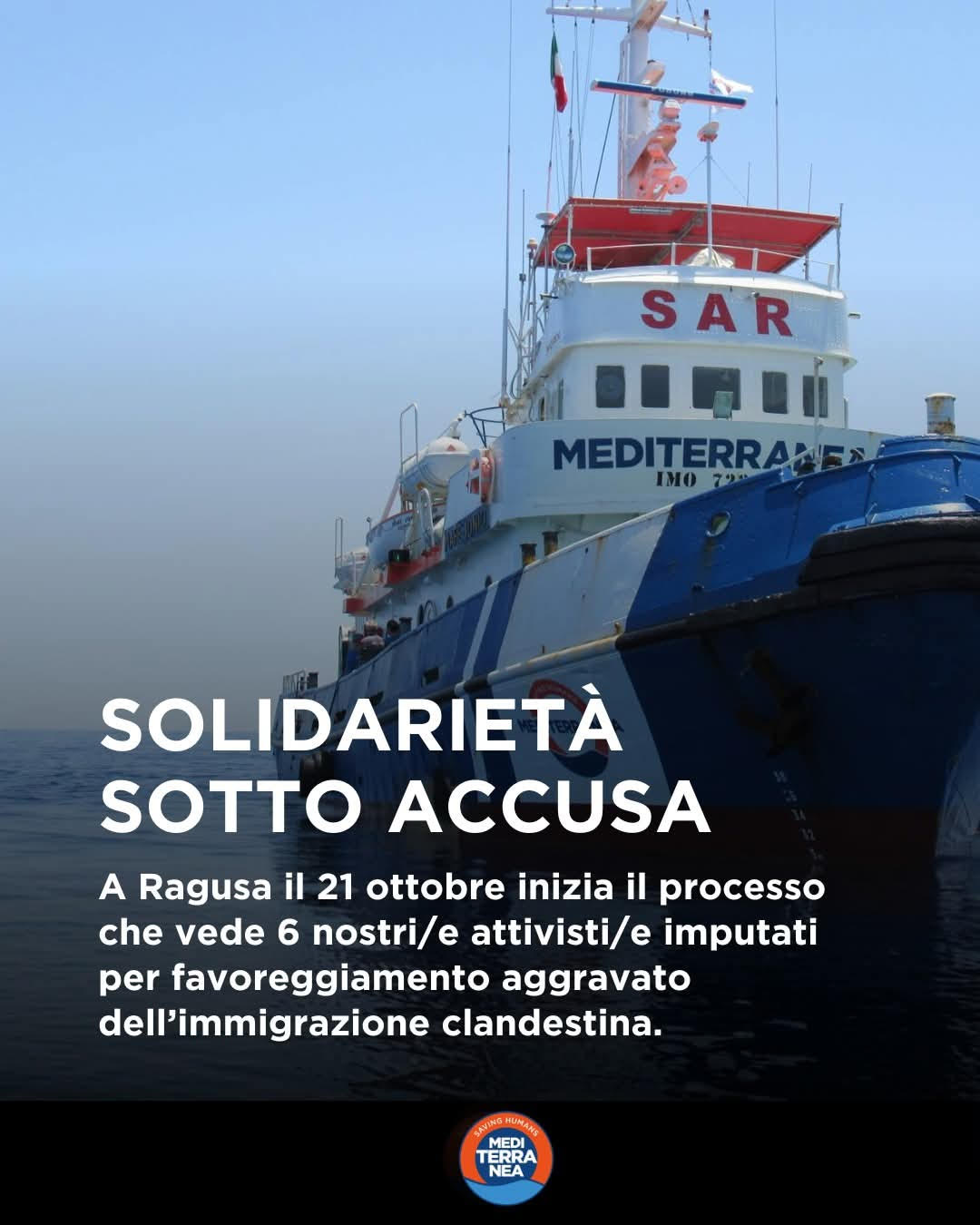 Ragusa, 21 Ottobre 2025  – Si è aperto oggi davanti al Tribunale di Ragusa il processo che vede sei persone sul banco degli imputati con la pesante accusa di “favoreggiamento aggravato dell’immigrazione clandestina” (secondo l’articolo 12 del Testo Unico sull’Immigrazione). La loro colpa? Avere a vario titolo preso parte alla missione della nostra nave Mare Jonio Saving Humas, che, nel settembre 2020, aveva soccorso 27 naufraghi che da 38 giorni si trovavano abbandonati da tutte le Autorità Europee (Malta e Danimarca in primis) a bordo della petroliera danese Maersk Etienne, proprio al largo delle isole maltesi. L’udienza è stata caratterizzata dalle eccezioni presentate dalla difesa: in particolare riguardo alle intercettazioni: sarebbero emersi nel fascicolo messaggi tra l’equipaggio e alcuni parlamentari(per il cui uso sarebbe necessaria l’autorizzazione del Parlamento), dello stesso equipaggio con vescovi e sacerdoti e, addirittura, con i difensori. Questi ultimi hanno chiesto l’esclusione di questi elementi probatori.