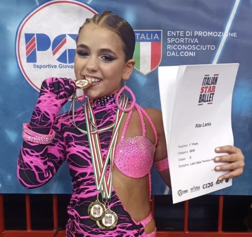 La Spezia, 2025 – Un weekend di pura emozione e successi per il Team Special Touch, guidato da Federica Re, che ha brillato all’Italian Star Ballet 2025 conquistando numerose medaglie d’oro. Le giovani promesse della danza hanno dimostrato talento, grinta e passione, portando a casa risultati straordinari in diverse discipline. Protagonista assoluta della competizione è stata Rita Lania, che ha conquistato la medaglia d’oro nelle categorie 8/9 D samba, cha cha, Team Special Touch e jive. Non da meno le eccezionali performance di Rita Lania insieme a Maria Selvaggia Arrabbito, che nel duo 10/12 D hanno dominato in tutte le discipline, aggiudicandosi l’oro in samba, cha cha, rumba e jive. Un risultato che conferma il livello altissimo del lavoro svolto dal team e l’impegno costante delle giovani ballerine. “Un grande successo per le mie piccole!”, ha commentato con orgoglio Federica Re, coach e coreografa del gruppo, ringraziando le sue allieve per la dedizione e la passione dimostrate in ogni esibizione. Il Team Special Touch continua così a distinguersi nel panorama nazionale della danza, portando alto il nome della scuola e confermando il proprio talento anche nelle competizioni più prestigiose.