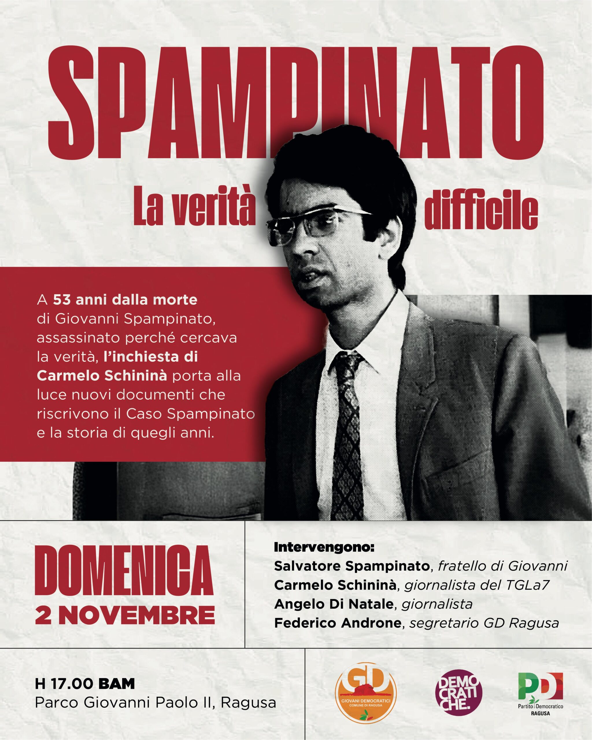 L’iniziativa si terrà domenica 2 novembre, alle ore 17 al BAM (Villa Margherita di Ragusa) e vedrà la partecipazione di Salvatore Spampinato, fratello di Giovanni e promotore della recente istanza di riapertura dell’inchiesta sull’omicidio, del giornalista Angelo Di Natale e di Carmelo Schininà, giornalista del TgLa7 e autore della serie di inchieste “Ragusa ’72. La sottile linea nera”, i cui ultimi capitoli, pubblicati in questi giorni su La Sicilia, stanno portando alla luce nuovi documenti e clamorose rivelazioni sul contesto politico ed eversivo nel quale maturò il delitto.