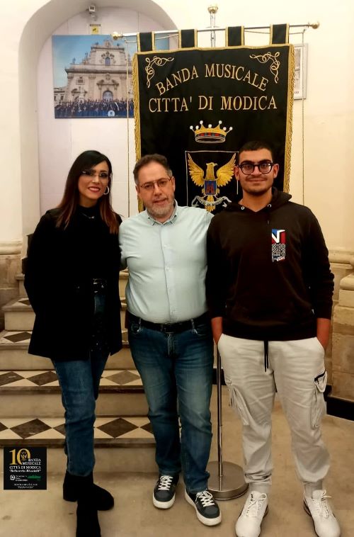 (Nella foto: da sinistra Giovanna Cicero Santalena, il direttore M° Corrado Civello e Marzio Fiderio, allievi della Scuola Musicale “Peppino Galfo” della Banda Musicale Città di Modica).