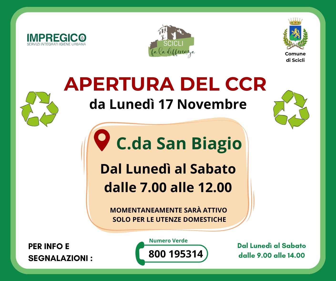 Inizia a funzionare quotidianamente intanto per le utenze domestiche il Centro Comunale di raccolta di contrada San Biagio dal 17 novembre, lunedì.