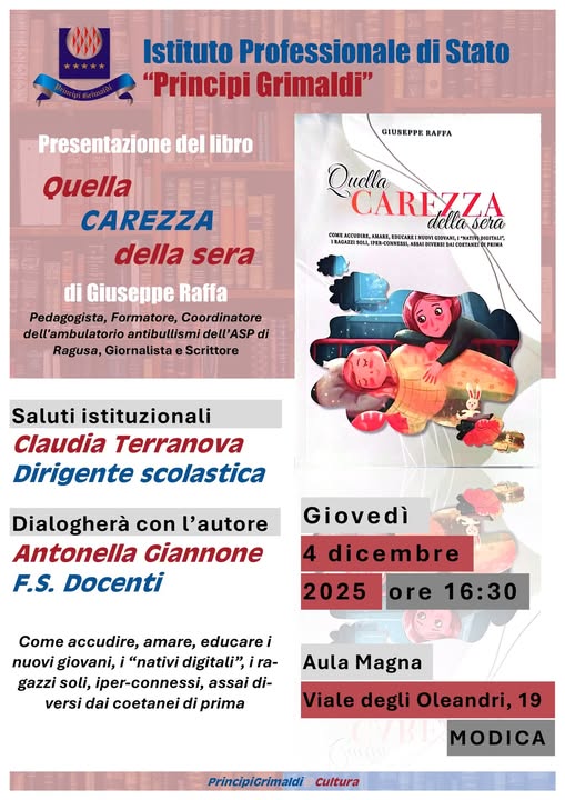 MODICA, 16 Novembre 2025 – La comunità scolastica e il territorio sono invitati a un importante appuntamento di riflessione e approfondimento sulle dinamiche educative e sociali dei giovani contemporanei. Giovedì 4 dicembre 2025, alle 16:30, l’Aula Magna dell’Istituto in Viale degli Oleandri ospiterà la presentazione del libro: “Quella carezza della sera – Come accudire, amare, educare i nuovi giovani, i “nativi digitali”, i ragazzi soli, iper-connessi, assai diversi dai coetanei di prima”.