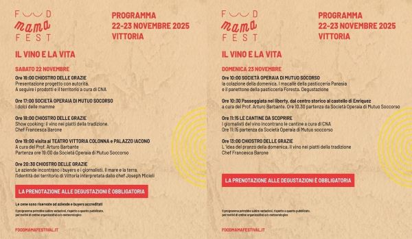 Vittoria, 20novembre 2025 – La manifestazione di promozione agro alimentare sta riscuotendo enormi consensi come è stato possibile registrare nei comuni in cui si sono svolte le due giornate ricche di appuntamenti. Ad oggi, sono stati protagonisti del Food i comuni di Comiso, Scicli, Ispica e, sabato e domenica, toccherà a Vittoria per finire, il 29 e il 30 novembre, a Modica. Anche nel comune ipparino, sono previste due giornate intense di promozione dei prodotti tipici del territorio, quali il vino e gli ortifrutticoli, elaborati durante gli show cooking dalle sapienti mani delle “mamme” e riproposti da chef stellati. A Vittoria, saranno infatti presenti Joseph Micieli e Francesca Barone. I prodotti tipici della zona sono forniti dalle aziende che operano nel territorio e che, durante gli appuntamenti, incontreranno giornalisti di settore e buyers poiché, uno degli obiettivi della manifestazione nei sei comuni iblei, è proprio quello di esternalizzare le nostre tipicità agrile e non solo. Al contempo, i vari appuntamenti del week end, si svolgeranno nelle location più suggestive per coniugare enogastronomia, cultura e turismo. In particolare a Vittoria, è previsto un tour delle cantine durante il quale, proprio la domenica, i visitatori saranno accolti da Silvana Raniolo presso la sua tenuta Bastonaca. Lei è tra le 100 donne del vino, e’ la tredicesima. Si farà una passeggiata in vigna e spiegherà il modo di coltivare ad alberello, preparerà degustazioni delle loro produzioni con un sostegno salato. Il Food Mama Festival, è organizzato dal Libero Consorzio di Ragusa, in collaborazione con CNA, grazie ad un finanziamento dell’Assessorato Regionale all’Agricoltura.