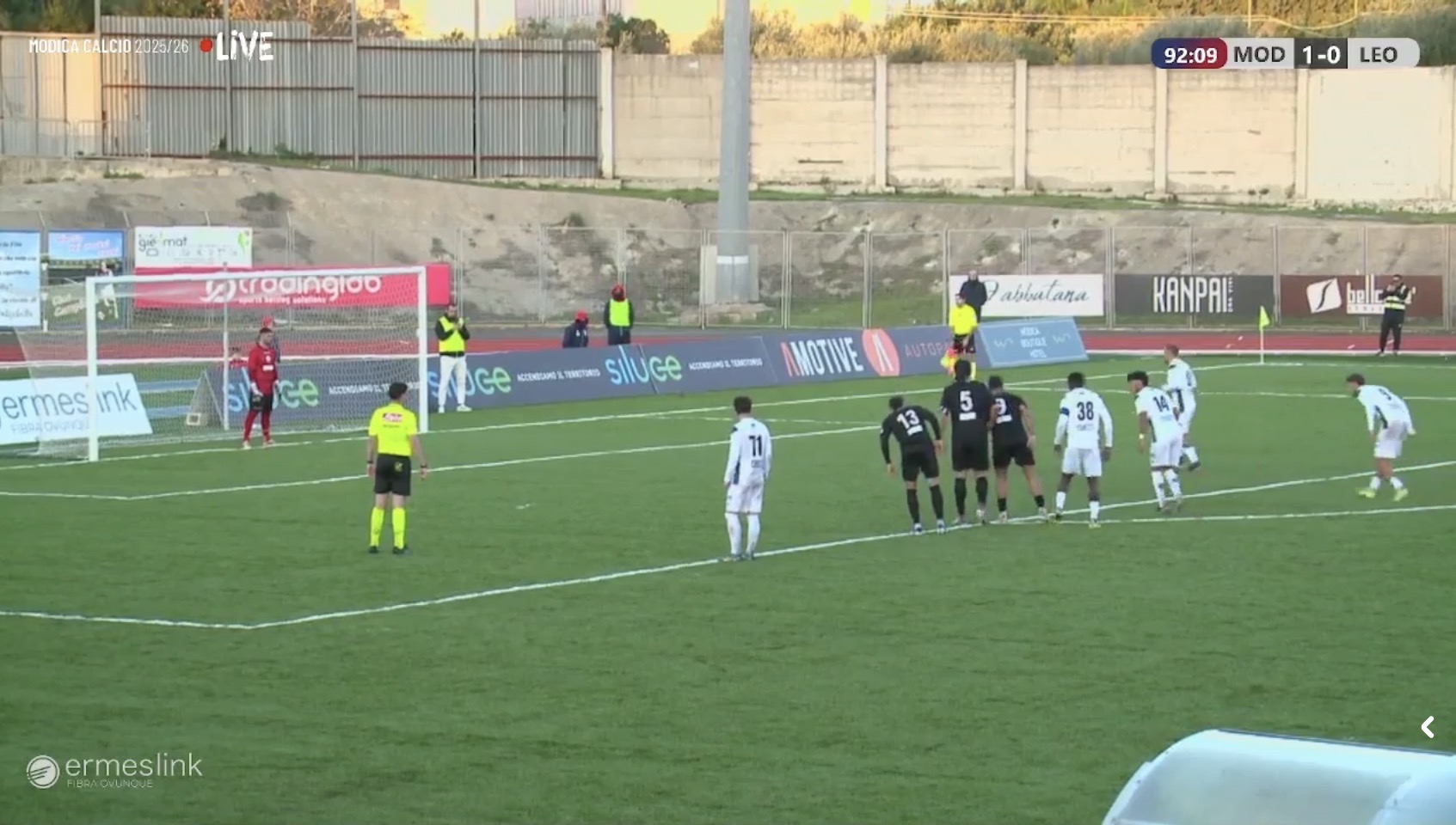Il raddoppio è arrivato solo un minuto dopo. L’arbitro ha concesso un calcio di rigore al Modica per un atterramento di Belluso da parte di Tornatore, un episodio che ha lasciato perplessi molti, ritenuto da più parti come un fischio generoso. Dal dischetto, però, Bonanno ha spiazzato il portiere, fissando il risultato sul definitivo 2-0 (nella foto il rigore).