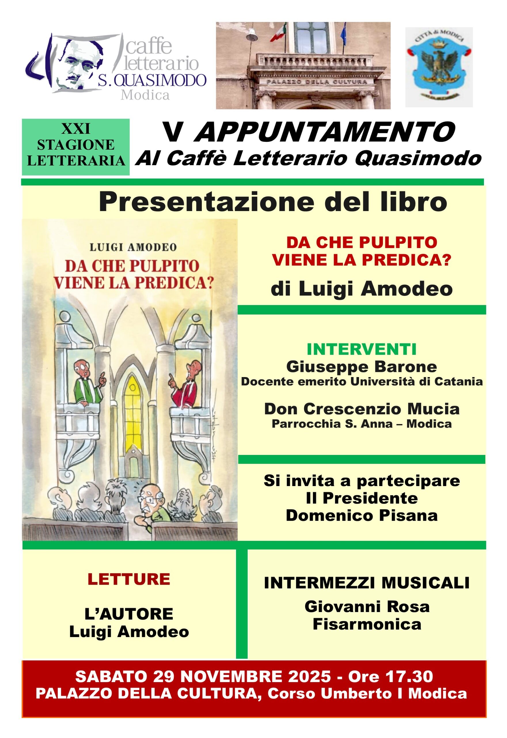 – Si terrà sabato 29 novembre, alle ore 17.30 al Palazzo della Cultura, il quinto appuntamento letterario del Caffè Quasimodo di Modica. Sarà dedicato allo scrittore Luigi Amodeo, e vedrà la presentazione del libro dal titolo “Da che pulpito viene la predica?”