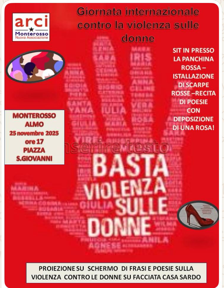Monterosso Almo, 24 novembre 2025 – Un forte messaggio di impegno civile e sensibilizzazione verrà lanciato dall’associazione ARCI Monterosso Nuova Associazione in occasione della Giornata Internazionale contro la Violenza sulle Donne, che celebrata domani , 25 novembre, con una serie iniziative pubbliche in Piazza San Giovanni con inizio alle ore 17. L’i iziativa avrà inizio con il sit-in presso la Panchina Rossa, simbolo della lotta contro i femminicidi, accompagnato dall’installazione di scarpe rosse, evocative delle vittime di violenza. Emozionante sarà la recita di poesie seguita da un gesto simbolico: la deposizione di una rosa in ricordo delle donne che non ci sono più.