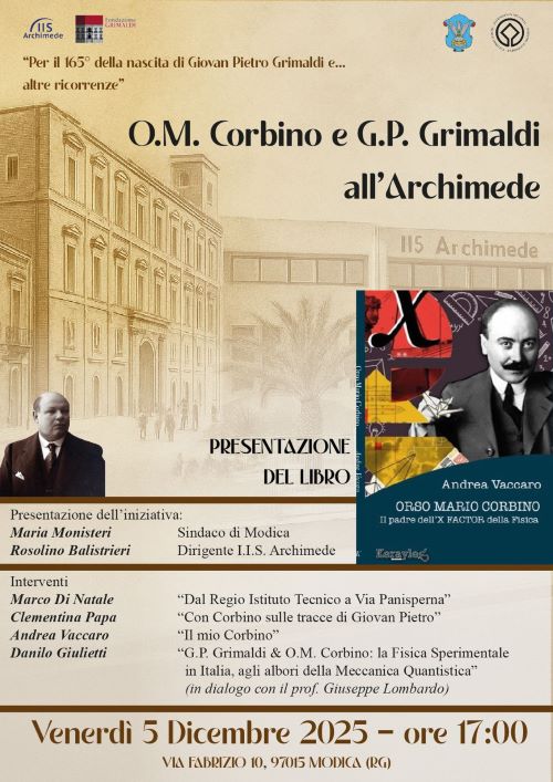 Modica, 01 dicembre 2025 – In questo 2025 che segna il 165mo della nascita di Giovan Pietro Grimaldi, presso l’Aula Magna  dell’ Istituto Archimede Ente promotore dell’evento,  in collaborazione con la Fondazione Grimaldi e con  il patrocinio del Comune di Modica,  sarà presentato venerdì  5 dicembre  alle 17.00   il libro dell’ing. Andrea Vaccaro  “ ORSO MARIO CORBINO  Il padre dell’X FACTOR della Fisica”: in esso  l’autore ricostruisce la vita  dello scienziato originario di Augusta (1876-1937), che fu anche manager e politico,   inquadrandola  nei contesti territoriali e storici in cui si svolse e, inaspettatamente,   fornisce elementi  significativi   per  ricordare la carriera scientifica di Giovan Pietro Grimaldi e i punti di contatto nella  formazione dei due;  implicitamente,  ripercorre “la nascita della Grande Fisica che tra fine Ottocento e i primi del Novecento muove dalla Sicilia”, come ha scritto la storica della Fisica M. Luisa Bonolis.  Nei fatti, Grimaldi  e Corbino e si laurearono  entrambi in fisica, il primo a Catania e il secondo a Palermo   con il prof. Damiano Macaluso e ne divennero assistenti ed entrambi  affiancarono  Pietro Blaserna, fisico di fama mondiale, prima a Palermo e poi a Roma,  nell’Istituto di Via Panisperna.
