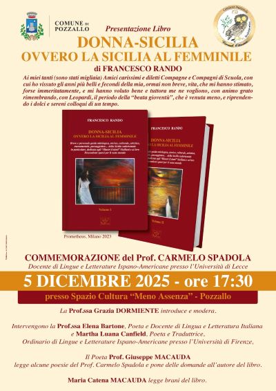 Pozzallo, 2 dicembre 2025 – Sarà un pomeriggio dedicato alla cultura, alla memoria e alla Sicilia quello in programma venerdì 5 dicembre 2025, alle ore 17:30, presso lo Spazio Cultura “Meno Assenza” di Pozzallo, dove si terrà la presentazione del libro “Donna-Sicilia, ovvero la Sicilia al femminile” di Francesco Rando, pubblicato da Prometheus (Milano, 2023). L’opera, articolata in due volumi, propone un percorso che intreccia mitologia, storia, arte, cultura, tradizioni e identità dell’isola, osservate attraverso una prospettiva femminile. Rando dedica il lavoro ai tanti amici e compagni della sua giovinezza, evocati con tono affettuoso e memoriale, e intreccia nel suo racconto figure, luoghi e simboli della Sicilia interiore e collettiva. L’incontro sarà introdotto e moderato dalla prof.ssa Grazia Dormiente, che guiderà il pubblico alla scoperta dei temi principali del progetto editoriale. La serata ospiterà anche un momento di commemorazione dedicato al prof. Carmelo Spadola, docente di Lingue e Letterature Ispano-Americane presso l’Università del Salento, figura intellettuale ricordata per il suo contributo alla ricerca e al dialogo interculturale.