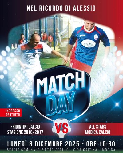 Modica, 02 dicembre 2025 — Una giornata di sport, memoria e comunità quella in programma lunedì 8 dicembre 2025, quando allo Stadio Comunale Pietro Scollo, in contrada Caitina, si svolgerà un incontro speciale dedicato al ricordo di Alessio Iabichella . A scendere in campo saranno il Frigintini Calcio (stagione 2016/2017) e una selezione All Stars Modica Calcio, per un match che vuole essere prima di tutto un momento di unione e condivisione attraverso il calcio, sport che Alessio amava profondamente. L’evento avrà ingresso gratuito e inizierà alle 10:30, offrendo ai tifosi e ai cittadini l’occasione di assistere a una mattinata di sport genuino, all’insegna di valori come amicizia, solidarietà e memoria collettiva. Numerose le realtà del territorio che compaiono tra i sostenitori dell’iniziativa, segno della vicinanza della comunità a un appuntamento dal forte valore umano oltre che sportivo. La partita celebrativa si preannuncia come un momento sentito e partecipato, un modo per onorare Alessio attraverso ciò che più rappresentava la sua passione: il pallone e il calore della sua gente.