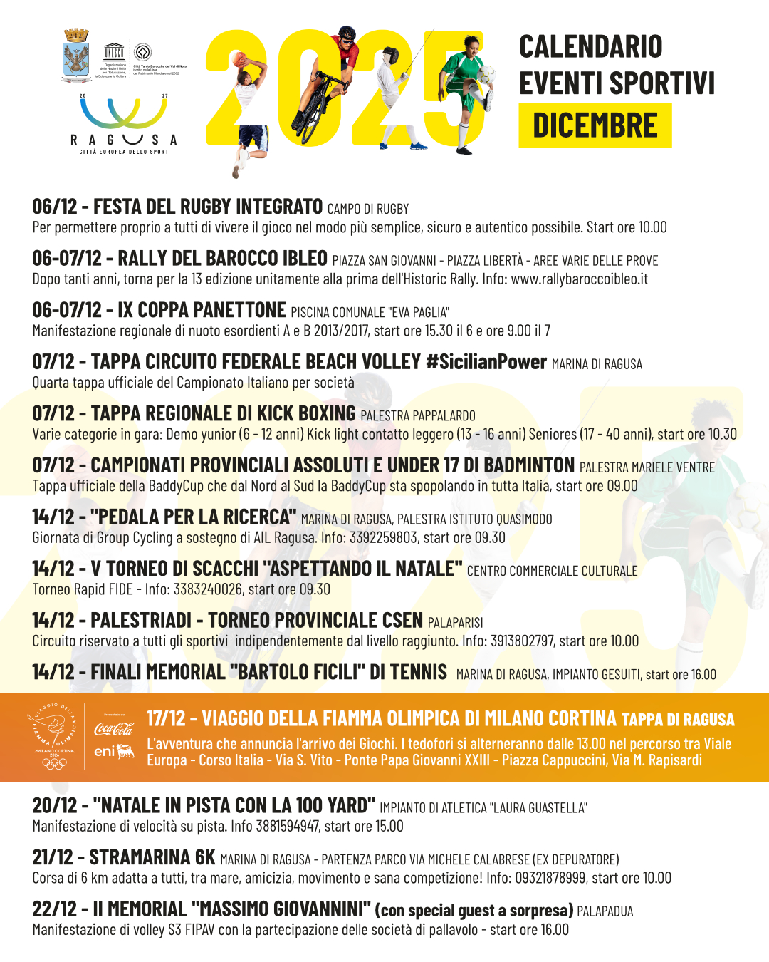Ragusa, 05 dicembre 2025 – Si chiude con un mese di dicembre ricco di appuntamenti l’anno di eventi sportivi 2025. Saranno infatti ben quattordici, per l’ultimo mese dell’anno, gli eventi che coinvolgeranno la città, abbracciando una varietà di discipline e offrendo occasioni di partecipazione e spettacolo per cittadini, sportivi e appassionati.