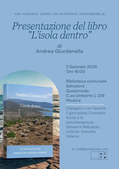 Modica, 27 dicembre 2025 – Sarà presentato venerdì 2 gennaio, alle 16, alla Biblioteca comunale di Modica, il libro di Andrea Giurdanella “L’isola dentro”. Si tratta della prima esperienza nella narrativa del giovane medico modicano che, da qualche anno, vive e lavora a Sassari. A dialogare con l’autore saranno il giornalista Concetto Iozzia e lo psicoterapeuta Giovanni Belluardo; le letture saranno curate da Assunta Adamo. L’appuntamento è realizzato in collaborazione con la libreria Zazie di Modica. “L’isola dentro” è il racconto di un’avventura iniziata in maniera drammatica e conclusa con il ritorno alla vita. E’ la fine di giugno del 2025, Andrea Giurdanella, 38 anni, sta trascorrendo un fine settimana di vacanza nell’isola dell’Asinara insieme ad alcuni colleghi. Durante una escursione in mountain bike per i sentieri sterrati dell’isola, Andrea cade e batte violentemente la testa a terra. Non ha il caschetto protettivo. Si rialza ma, poco dopo, perde conoscenza: con l’elisoccorso viene trasportato in ospedale per essere operato: grave trauma cranico con emorragia epidurale. L’intervento riesce ma il pericolo di vita persiste. Si risveglia dopo giorni di coma e, grazie ai suoi colleghi medici, ricostruisce quanto è avvenuto, fino alla guarigione che sembrava impossibile. Tanto che i suoi amici ora lo chiamano scherzosamente “Lazzaro”.