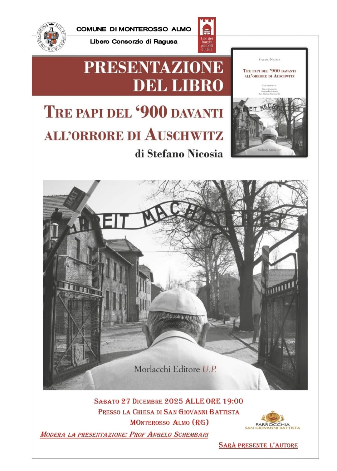 Monterosso Almo, 27 dicembre 2025 – Nei locali della chiesa di San Giovanni Battista alle 19 verrà presentato il libro di Stefano Nicosia dal titolo “ Tre Papi del ‘900 davanti all’orrore di Auschwitz”. Modererà la presentazione lo storico professore Angelo Schembari.