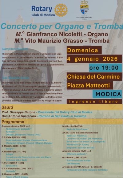 Modica, 31 dicembre 2025 – La suggestiva cornice della Chiesa del Carmine, in Piazza Matteotti, ospiterà domenica 4 gennaio 2026 alle ore 19:00 il Concerto per Organo e Tromba, un appuntamento musicale di grande prestigio promosso dal Rotary Club di Modica. L’ingresso sarà libero, offrendo a cittadini e visitatori un’occasione unica per immergersi nella musica sacra e barocca. Protagonisti della serata saranno due musicisti di alto profilo: il M° Gianfranco Nicoletti all’organo e il M° Vito Maurizio Grasso alla tromba.