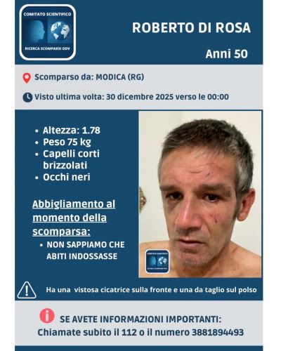 Modica, 31 dicembre 2025 – È stato denunciato come scomparso Roberto Di Rosa, 50 anni, residente a Modica, che si è allontanato dalla propria abitazione nella notte tra il 29 e il 30 dicembre. I familiari, non avendo più sue notizie, hanno presentato regolare denuncia ai Carabinieri, che hanno avviato le ricerche. L’uomo è alto 1 metro e 78 centimetri, pesa circa 75 chili e ha capelli brizzolati. Presenta inoltre segni particolari ben riconoscibili: una vistosa cicatrice sulla fronte e una cicatrice da taglio su un polso, elementi che potrebbero agevolarne l’identificazione. Al momento della scomparsa non è noto l’abbigliamento che indossava. Le ricerche sono in corso e i familiari rivolgono un accorato appello a chiunque possa averlo visto o abbia informazioni utili. Chiunque avvistasse Roberto Di Rosa o fosse in possesso di notizie è pregato di contattare immediatamente il numero di emergenza 112 oppure il numero dedicato 388 189 4493. Ogni segnalazione, anche la più piccola, potrebbe rivelarsi fondamentale.