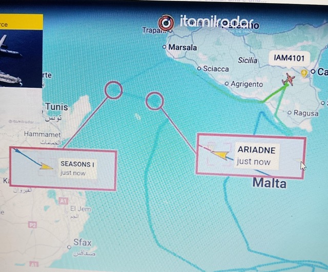 Nel corso della missione, l’aereo spia P-72A ha intercettato e monitorato due imbarcazioni considerate sospette. La prima era la nave cargo Ariadne (IMO 9397547), battente bandiera russa. Secondo i dati di tracciamento disponibili, citati da “Itamilradar”, l’aereo italiano ha orbitato attorno alla nave per un periodo prolungato. “Si tratta di un profilo di volo tipicamente associato a un’identificazione dettagliata, una classificazione e un monitoraggio delle attività piuttosto che a un semplice sorvolo. Questo tipo di comportamento suggerisce un’attenzione deliberata alla comprensione dello stato, della rotta e del potenziale ruolo della nave all’interno di schemi di traffico marittimo più ampi” spiegano gli analisti.