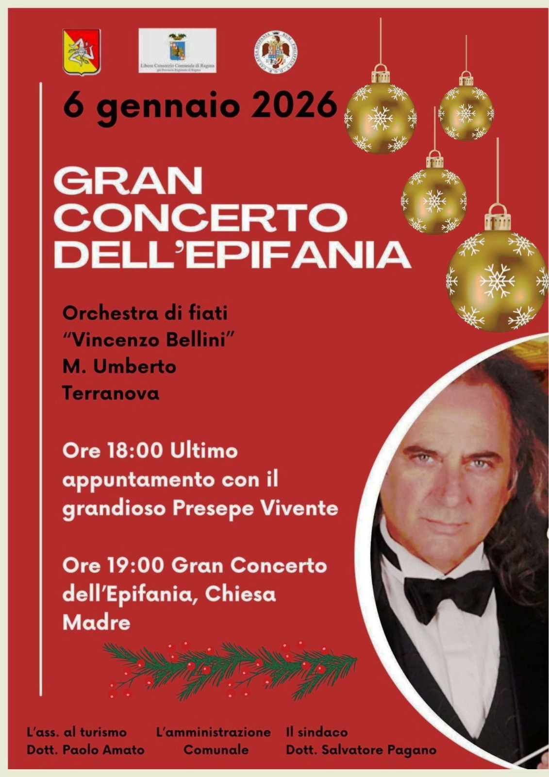 A seguire, alle 19,00, presso la Chiesa Madre, si terrà il Gran Concerto dell’Epifania a cura della Orchestra di fiati “Vincenzo Bellini” diretta dal maestro Umberto Terranova. Il concerto spazierà tra musica sacra e brani natalizi.
