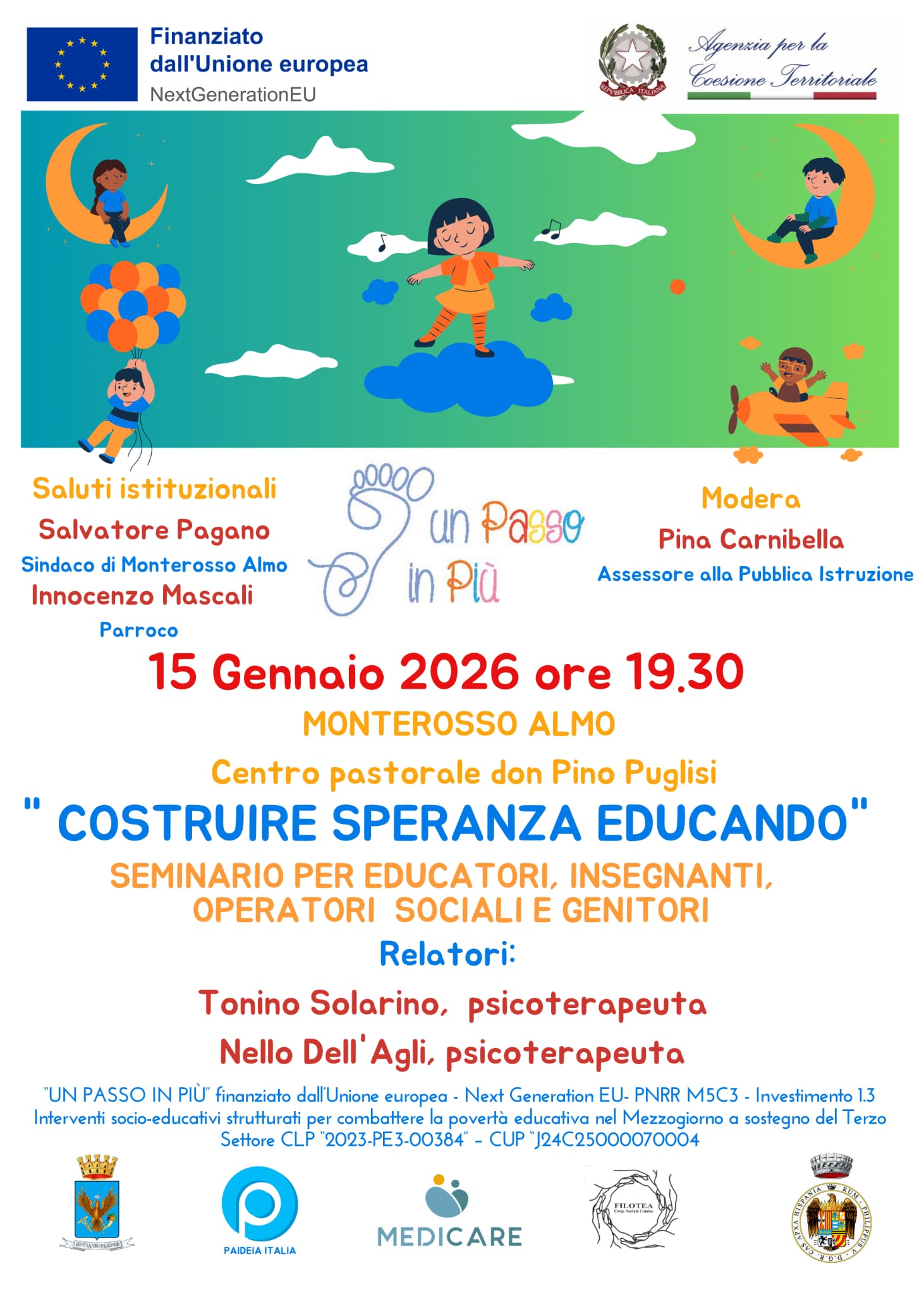 Monterosso Almo, 11 gennaio 2026 – Il prossimo 15 gennaio alle ore 19,30, presso il Centro Pastorale Don Pino Puglisi, si terrà il seminario “ Costruire speranza educando”, un momento di formazione e confronto rivolto a educatori, insegnanti, operatori sociali e genitori. L’iniziativa rientra nel progetto “Un Passo in Più”, finanziato dall’Unione Europea – Next Generation EU nell’ambito del PNRR (Missione 5, Componente 3, Investimento 1.3), mirato a realizzare interventi socio-educativi strutturati per contrastare la povertà educativa nel Mezzogiorno e sostenere il Terzo Settore.