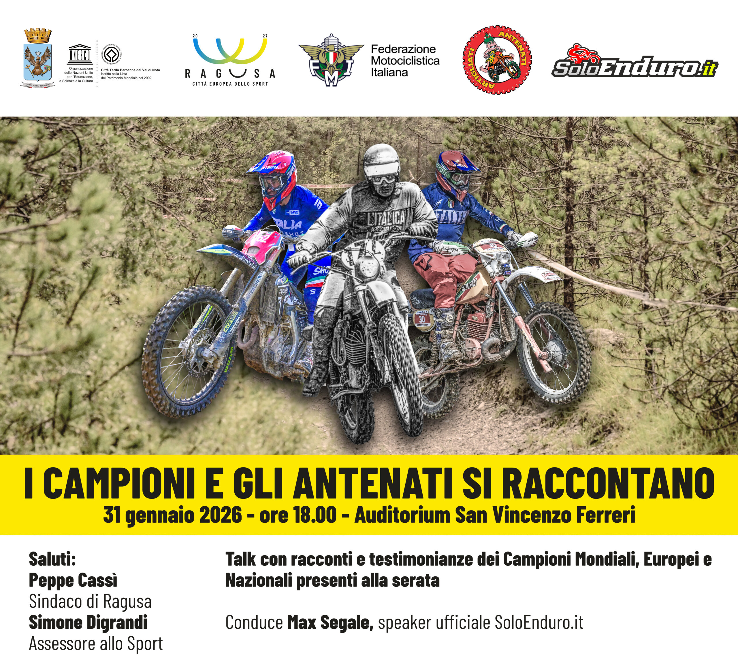 Ragusa, 29 gennaio 2026 – Sabato 31 gennaio, nell’ambito del terzo raduno nazionale degli “Antenati Artigliati” di Enduro che avrà luogo a Ragusa nel prossimo weekend, all’Auditorium San Vincenzo Ferreri si terrà una serata di approfondimento dedicata al mondo dello sport motociclistico, con la partecipazione di protagonisti storici e contemporanei di livello internazionale della disciplina. La serata è organizzata da un gruppo di appassionati ragusani del settore insieme al Moto Club Scicli e rientra nel programma del primo semestre di eventi sportivi promossi dal Comune di Ragusa. Media partner la testata online nazionale soloenduro.it.