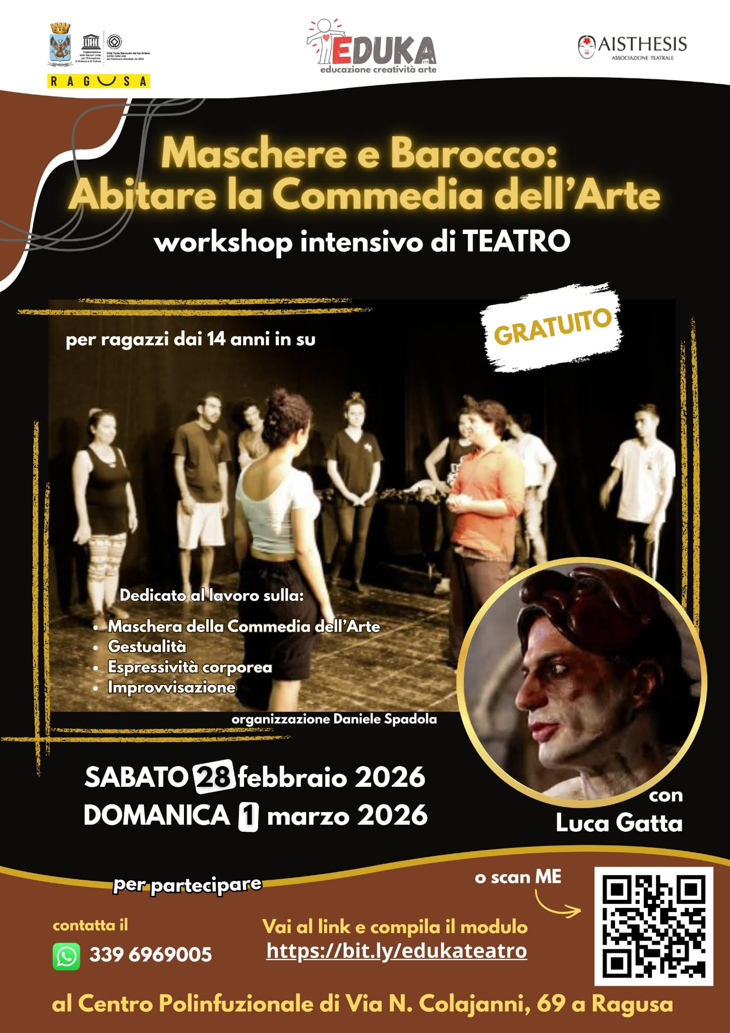 Ragusa, 17 febbraio 2026 – Unire formazione teatrale, crescita personale, valorizzazione culturale e riscoperta storica, mettendo in dialogo la Commedia dell’Arte, patrimonio della tradizione italiana, e la ricchezza artistica e identitaria del Barocco ragusano attraverso il linguaggio espressivo del teatro. È l’obiettivo del workshop teatrale “Maschere e Barocco – Abitare la Commedia dell’Arte”, progetto completamente gratuito rivolto agli studenti delle scuole secondarie di secondo grado, organizzato da EDUKA ETS con il sostegno dall’Assessorato alla Pubblica Istruzione del Comune di Ragusa.