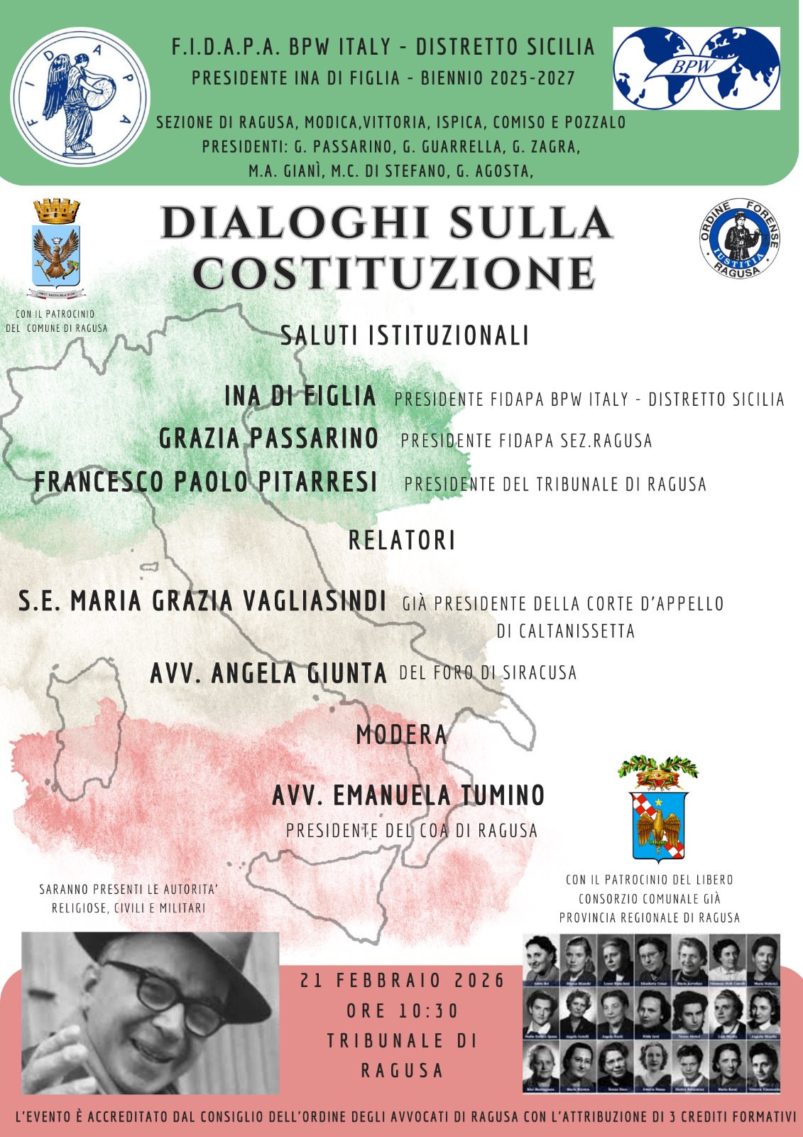 Ragusa, 19 febbraio 2026 – In occasione dell’80° anniversario dell’Assemblea Costituente, FIDAPA BPW Italy – Distretto Sicilia promuove l’iniziativa “Dialoghi sulla Costituzione”, un incontro dedicato alla riflessione sui valori fondanti della Repubblica italiana e sull’attualità della Carta costituzionale.