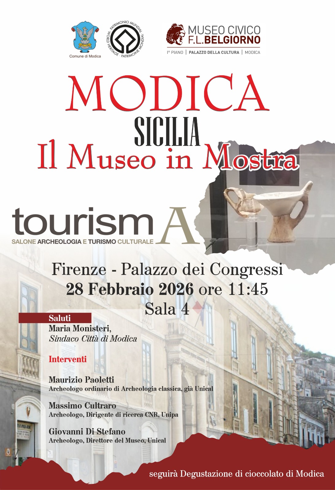 Modica, 24 Febbraio 2026 – Anche nel 2026 Modica e il Museo Civico “Franco Libero Belgiorno”, saranno presenti a Firenze per Tourisma. Il prossimo 28 febbraio, al Palazzo dei Congressi, nell’ambito della manifestazione rivolta a tutte le realtà culturali nazionali e internazionali, saranno presentate le mostre archeologiche attualmente nel museo. Tourisma è un momento di esposizione, divulgazione e confronto di tutte le iniziative legate alla comunicazione del mondo antico e alla valorizzazione delle sue testimonianze.
