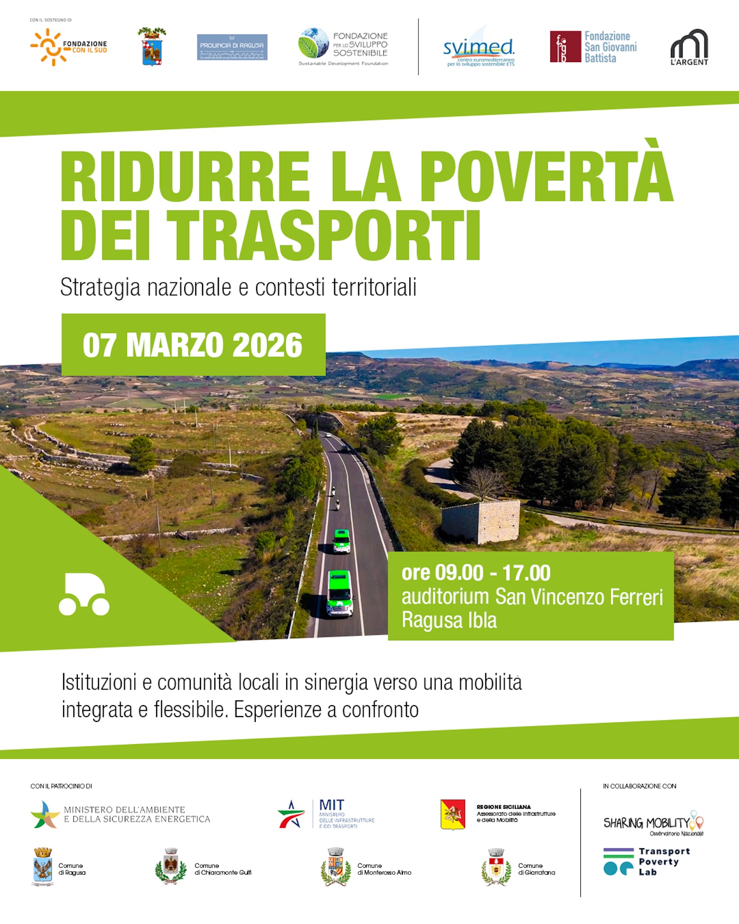 L’iniziativa è realizzata con il supporto della Fondazione con il Sud, della Fondazione per lo Sviluppo Sostenibile e del Libero Consorzio Comunale di Ragusa, con il patrocinio del Ministero dell’Ambiente e della Sicurezza Energetica (MASE), del Ministero delle Infrastrutture e dei Trasporti (MIT), dell’Assessorato alle Infrastrutture e Mobilità della Regione Siciliana, dei Comuni di Ragusa, Chiaramonte Gulfi, Giarratana e Monterosso Almo, e con il supporto tecnico dell’Osservatorio Nazionale sulla Sharing Mobility e del Transport Poverty Lab.