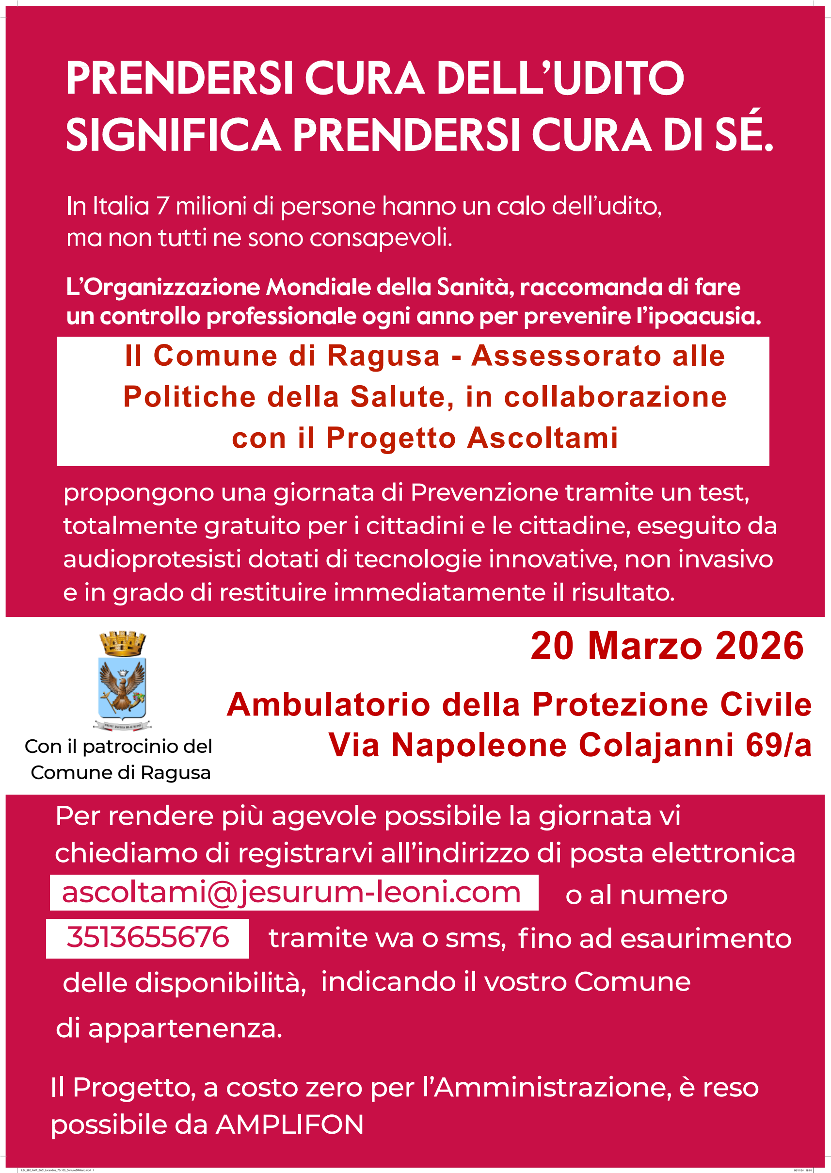 Ragusa, 04 marzo 2026 – Prendersi cura del proprio udito significa prendersi cura di sé. Con questo spirito, continua l’attività legata alla prevenzione da parte dell’Assessorato alle Politiche della Salute del Comune di Ragusa, in collaborazione con il Progetto “Ascoltami” e con il supporto di Amplifon, promuove una giornata dedicata alla prevenzione dell’ipoacusia. Questa iniziativa segue quelle relative all’aderenza terapeutica e agli screening gratuiti oncologici alla mammella.