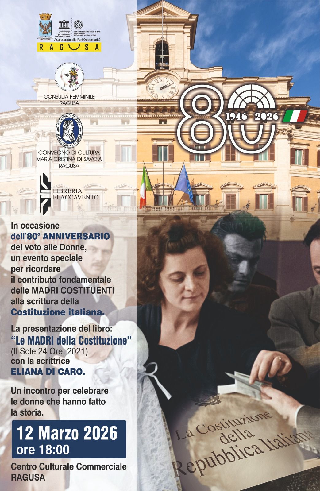 Il 12 marzo 2026, alle ore 18.00, presso il Centro Culturale Commerciale di Ragusa, sarà ospite la giornalista e scrittrice Eliana Di Caro, autrice del libro Le Madri della Costituzione, dedicato alle ventuno donne che parteciparono alla stesura della Costituzione della Repubblica Italiana.