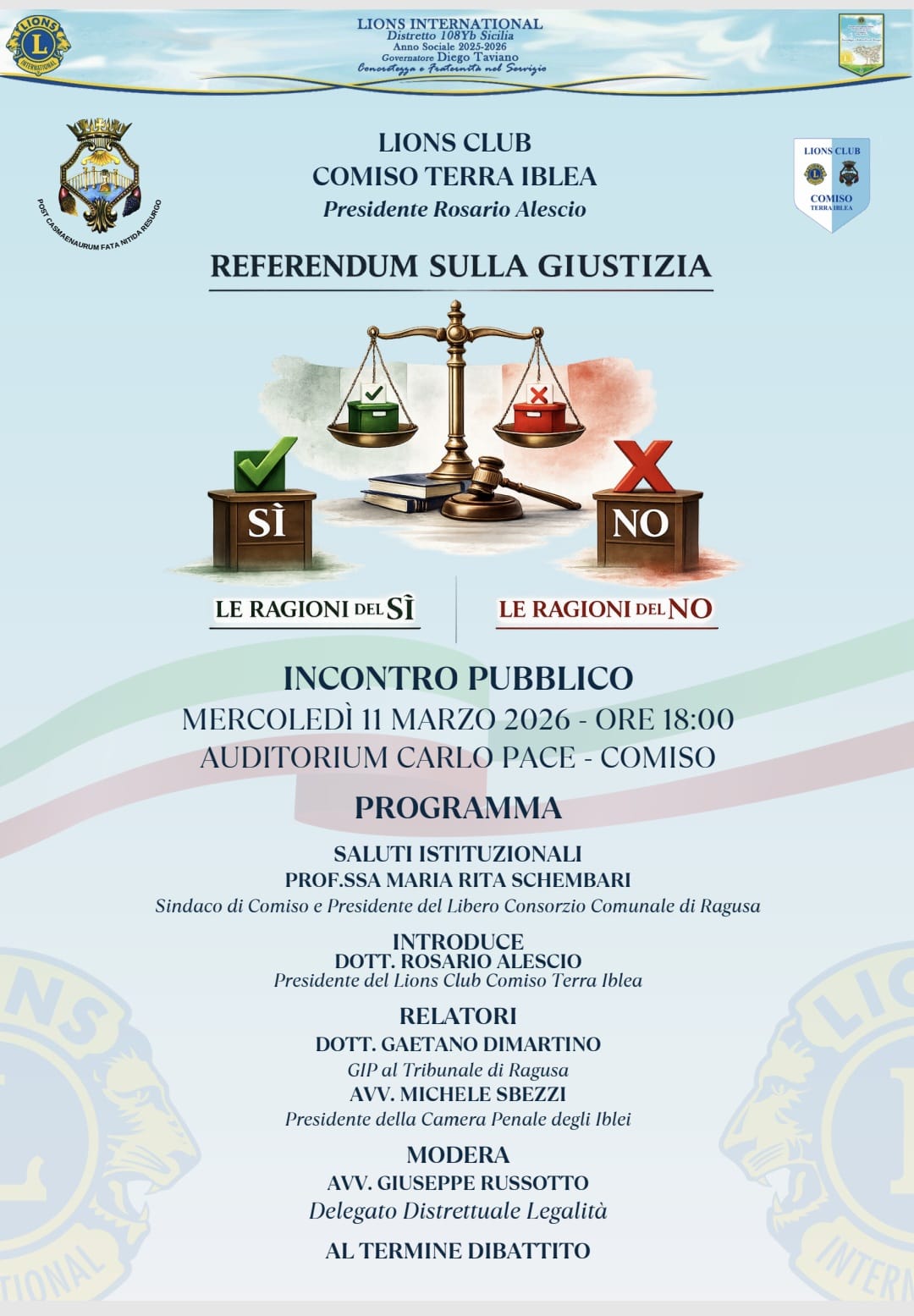 Comiso, 05 marzo 2026 – Il Lions Club Comiso Terra Iblea, presieduto da Rosario Alescio, organizza un incontro pubblico sul tema del Referendum sulla Giustizia, che si terrà mercoledì prossimo 11 marzo alle ore 18,00 presso l’Auditorium Carlo Pace di Comiso. L’incontro sarà aperto dai saluti istituzionali della prof.ssa Maria Rita Schembari, Sindaco di Comiso e Presidente del Libero Consorzio Comunale di Ragusa, e del dott. Rosario Alescio, Presidente del Lions Club Comiso Terra Iblea.