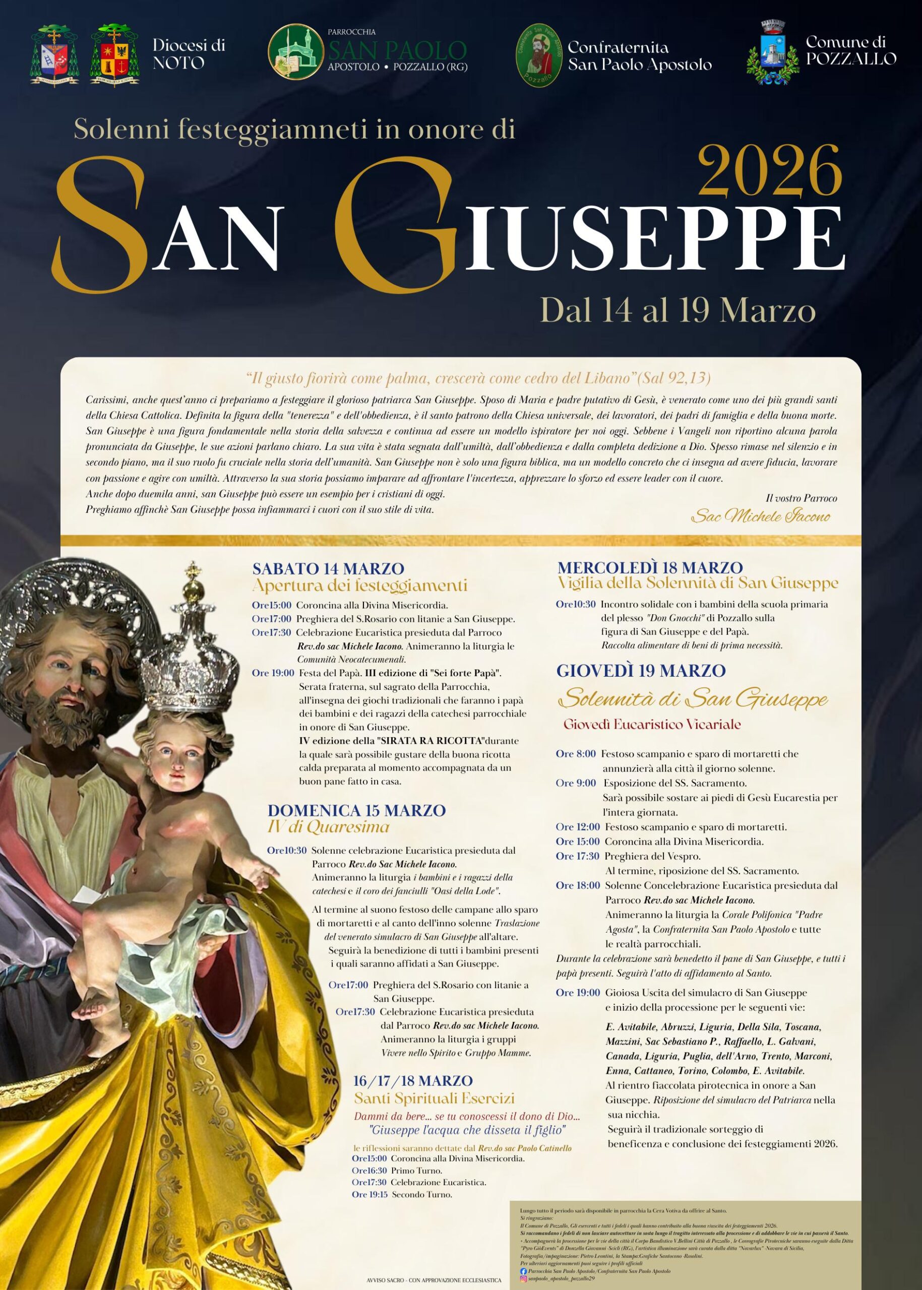 Pozzallo, 08 Marzo 2026 – La città di Pozzallo si risveglia sotto il segno della fede e della tradizione. La comunità parrocchiale di San Paolo Apostolo è pronta a rendere omaggio al “Glorioso Patriarca”, San Giuseppe, custode della Santa Famiglia e simbolo universale di dedizione per padri e lavoratori. Il programma 2026 promette di unire il raccoglimento spirituale a momenti di vivace convivialità cittadina.