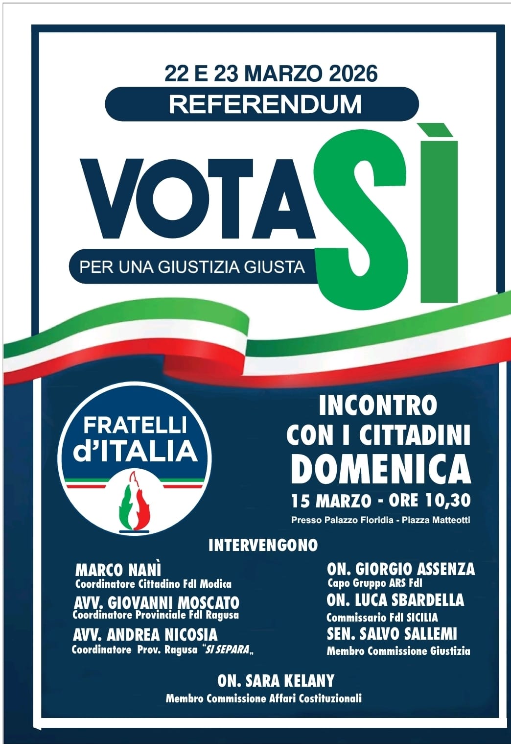 MODICA, 08 Marzo 2026 – In vista dell’appuntamento referendario del 22 e 23 marzo 2026, Fratelli d’Italia organizza un momento di confronto diretto con la cittadinanza. Lo slogan scelto, “Vota Sì per una giustizia giusta”, lancia un messaggio chiaro sulla linea del partito riguardo ai temi della riforma giudiziaria.