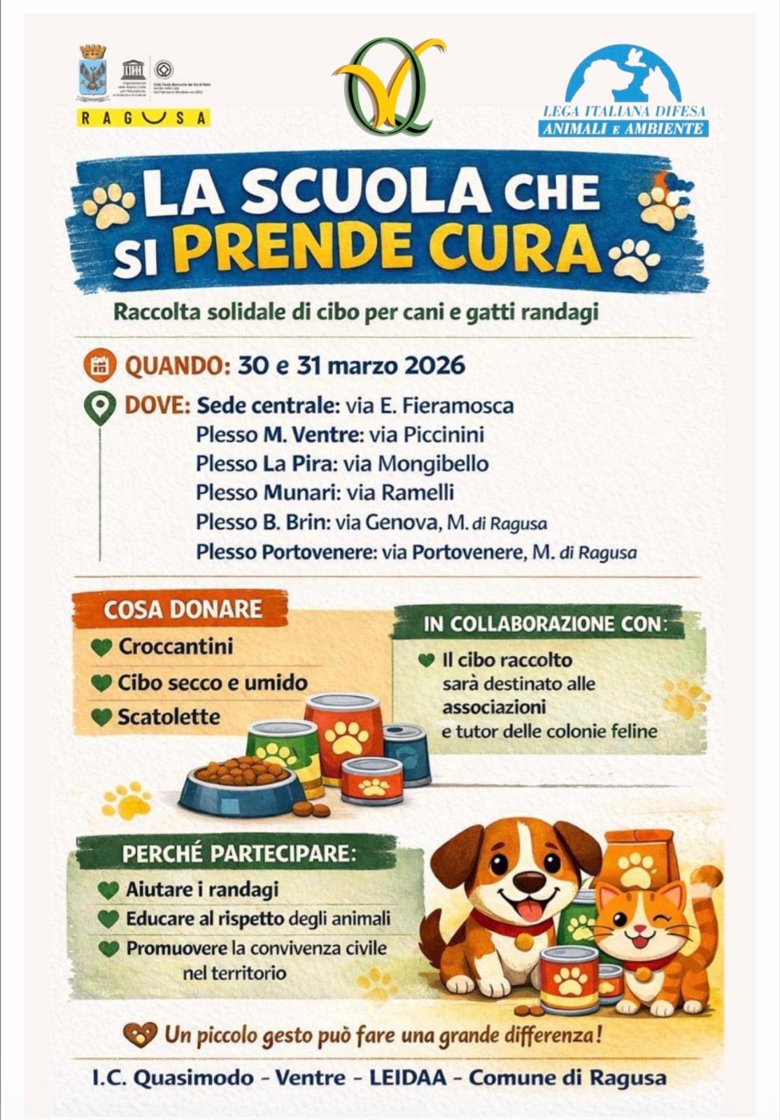 Ragusa, 16 marzo 2026 – Il Comune di Ragusa, l’Istituto Comprensivo “Quasimodo-Ventre” e l’associazione LEIDAA Iblea promuovono il progetto solidale “La scuola che si prende cura”, un’iniziativa di raccolta di cibo destinato ai cani e ai gatti randagi presenti sul territorio comunale.